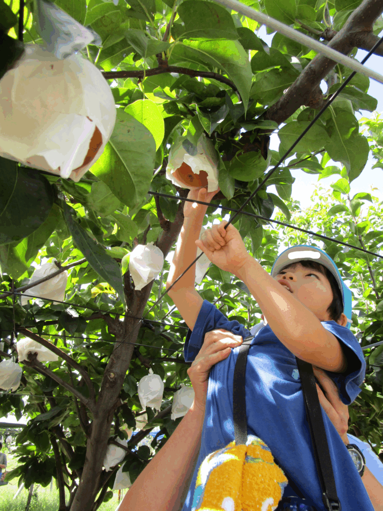 なしは両手で持って上に持ち上げたり、左右に揺らしたりして手でもぐことを教えてもらい、被っている袋がパンパンになるぐらいに丸く大きくなっているなしを収穫してねと教えてもらいました。