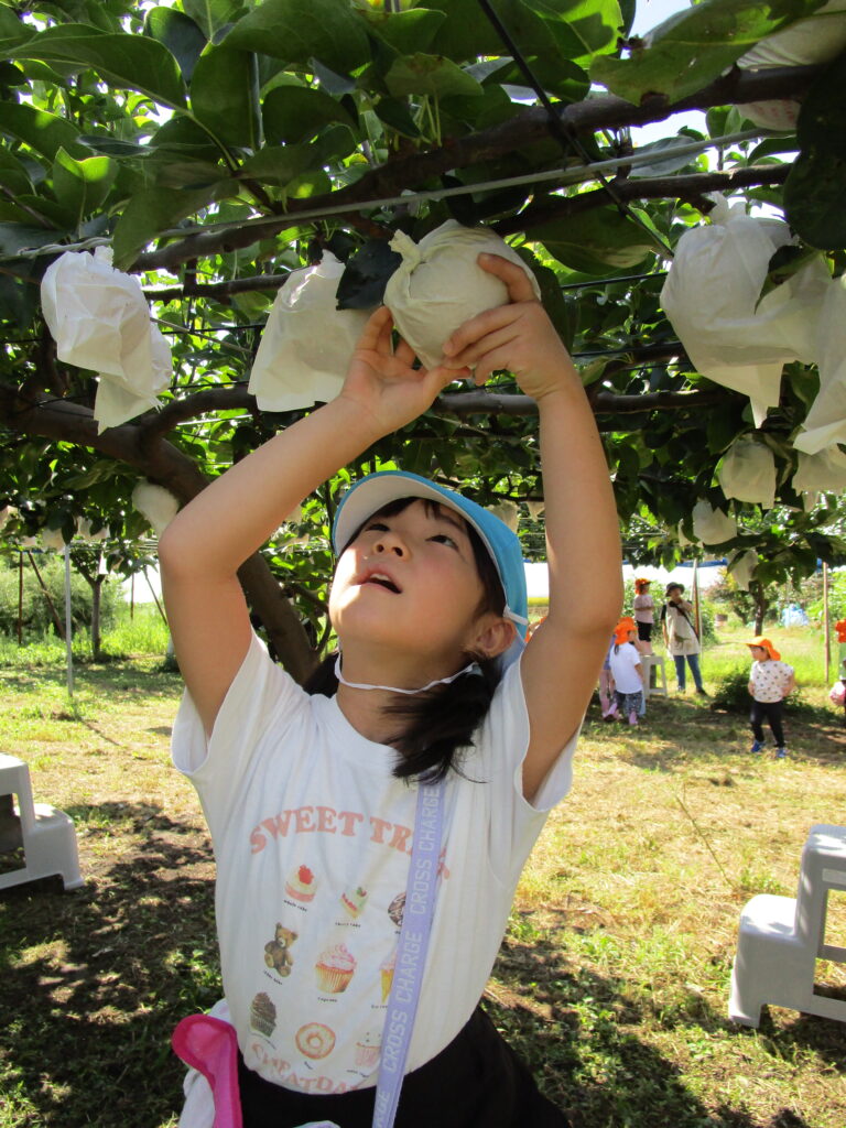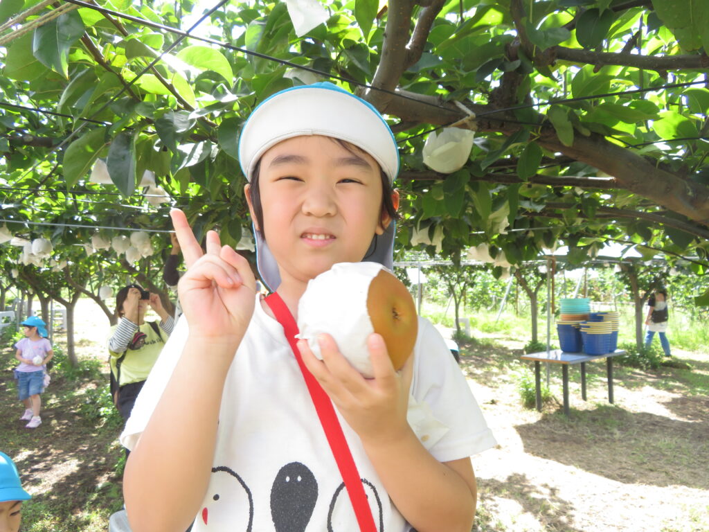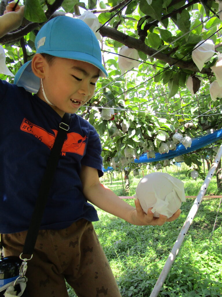自分で選んで収穫したなしは、とっても嬉しかったようで、誇らしげに保育者に見せてくれたり、お友だちと色や大きさを見せ合いしながら楽しそうな子どもたちでした😊