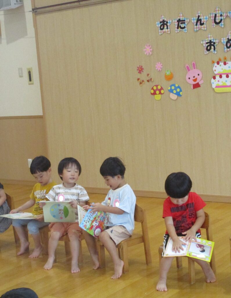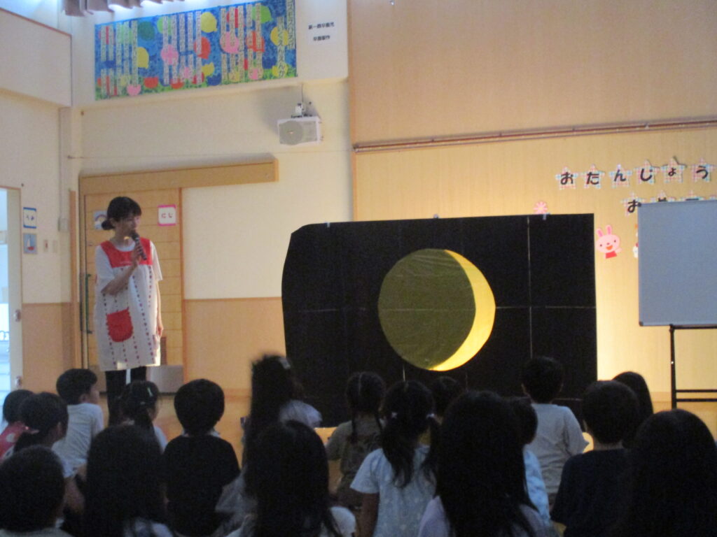 9月9日は誕生会がありました。9月生まれの友達をお祝い、職員による十五夜やお月見のお楽しみを見ました。月の見え方のシルエットクイズやお月見に飾る物のクイズなど興味深々の子ども達でした。