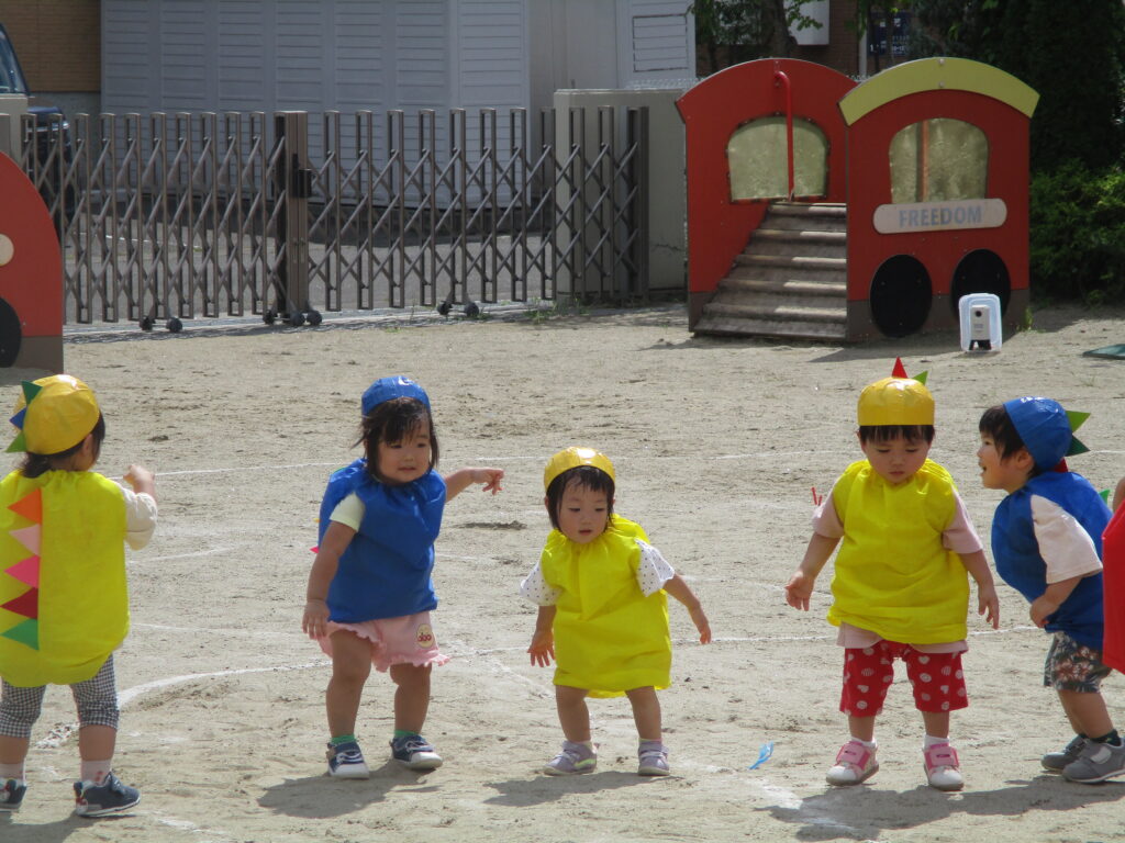 にじ組(2歳児)は素敵な帽子をかぶり♪おどるポンポコリンを踊ったり、かけっこも頑張りました。