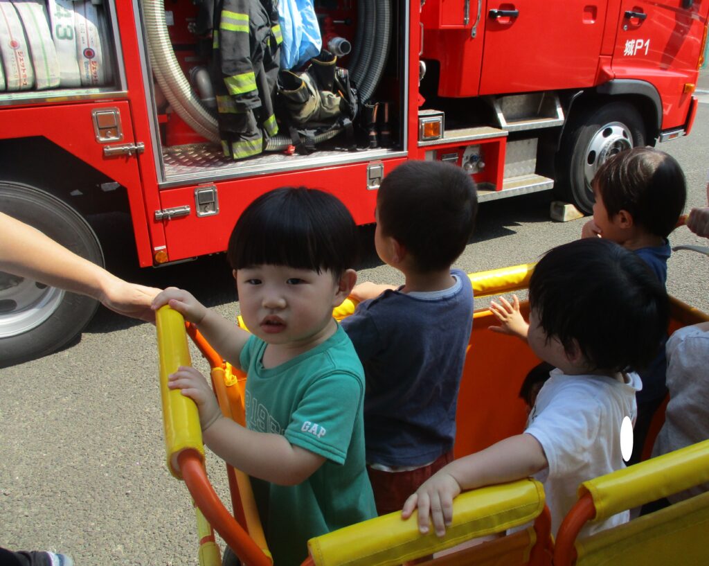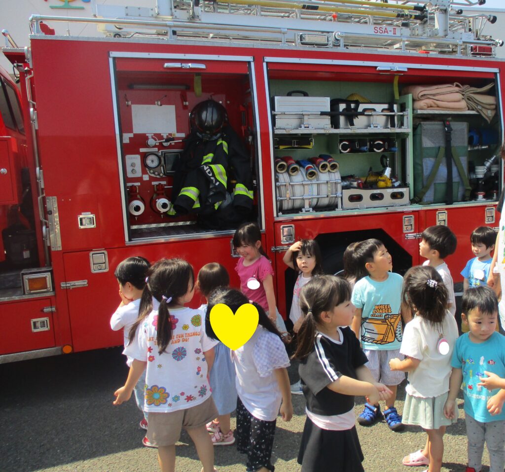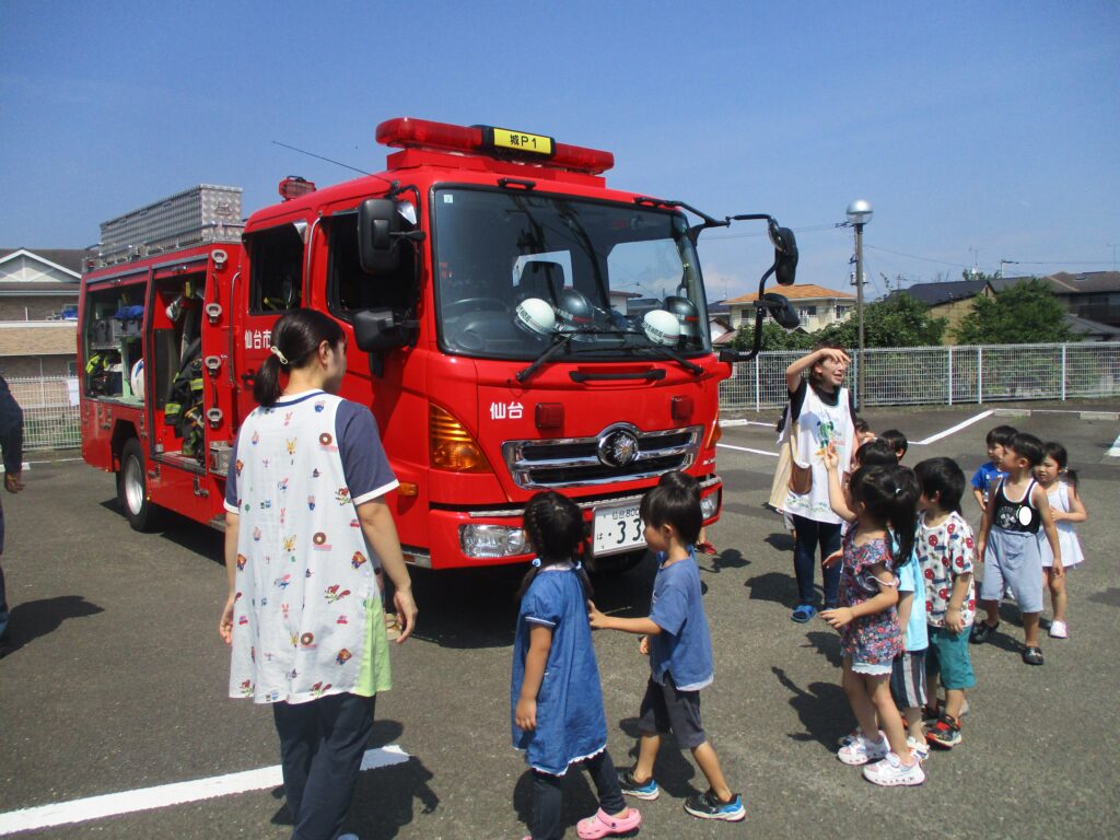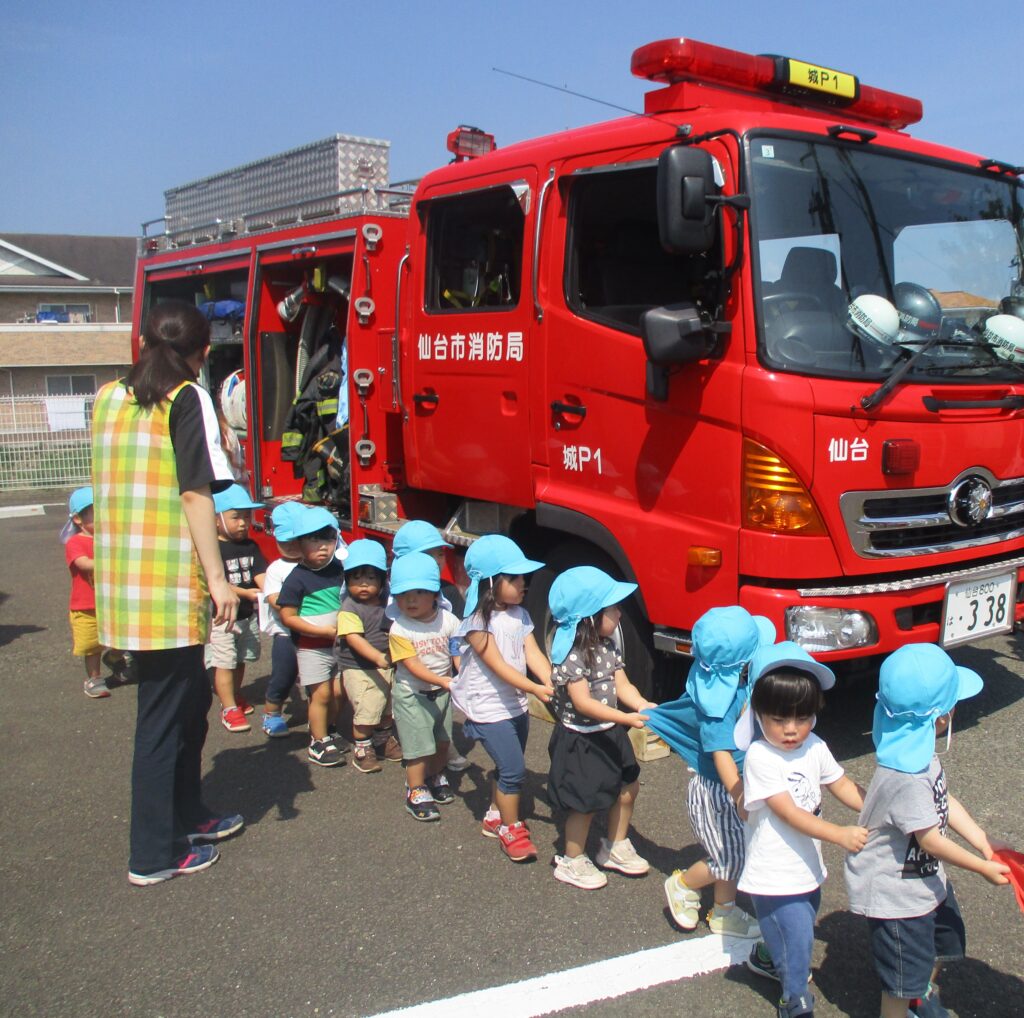 9月1日には総合防災訓練が行われました。避難訓練の様子を消防署の方に見てもらい、火事の時はどうしたらいいのか約束事を再確認しました。職員の消火訓練では「先生がんばれー!」と応援してくれた子ども達です。最後は消防車を見学しました。