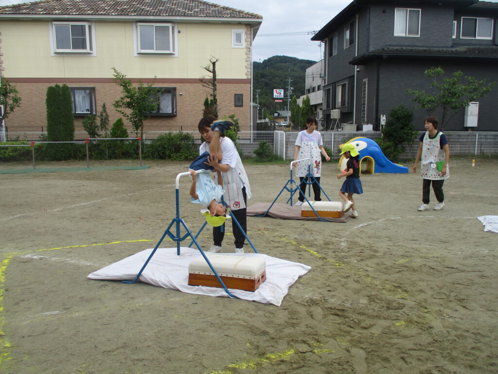 つき組(4歳児)は扇子を持ちすずめ踊りをしたり、個人競技ではマットでの前転、鉄棒を披露しました。