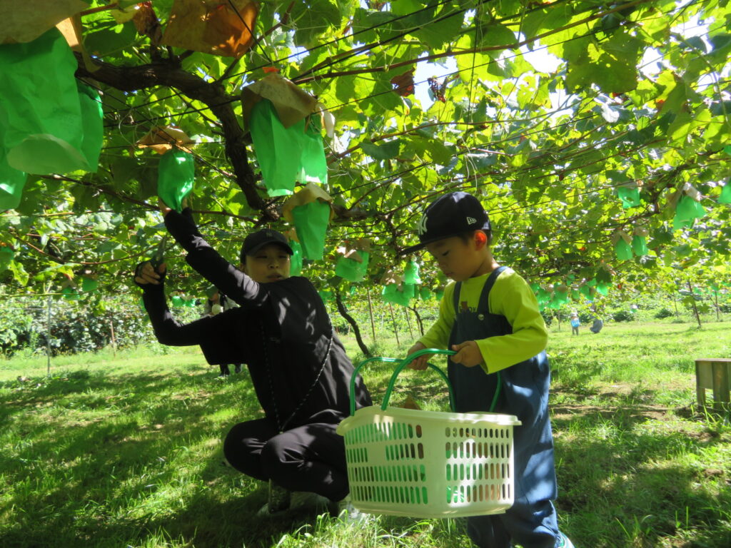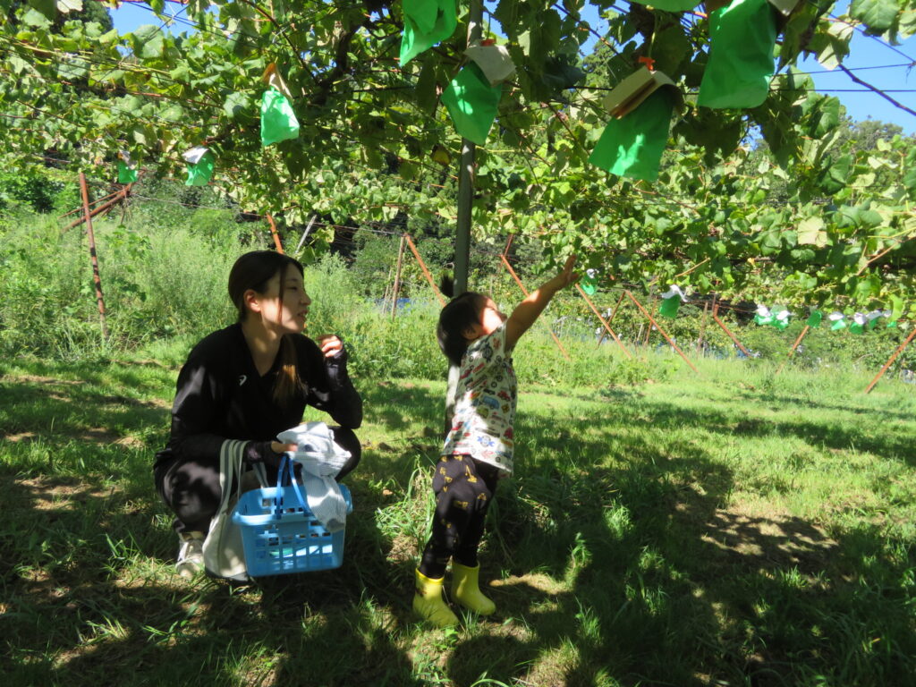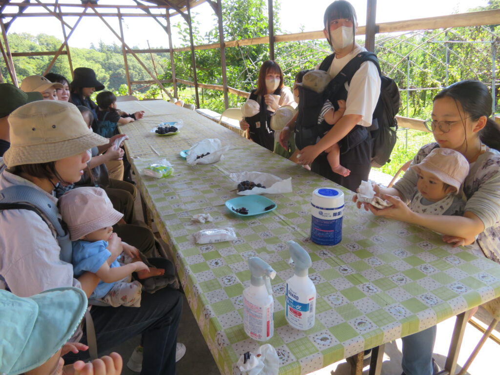 まのワンピース・トキっ子ひろば・おおぞら吉井の3施設合同イベントで小松農園さんにぶどう狩りに行きました。ブラックオリンピアを試食しながら自己紹介をし交流をしました。