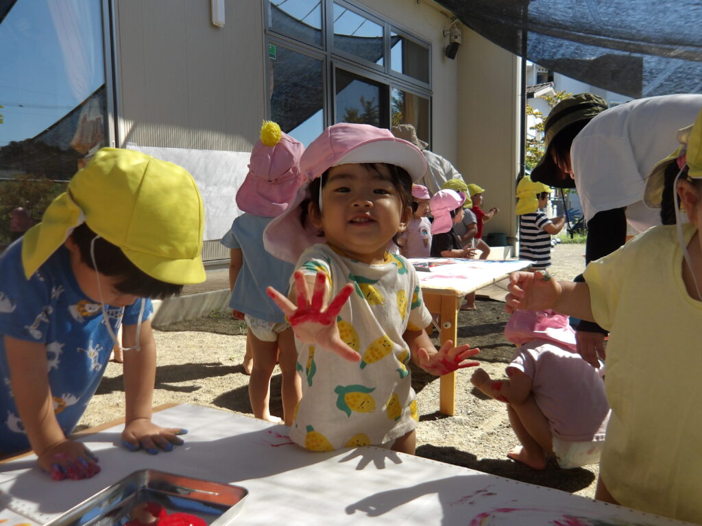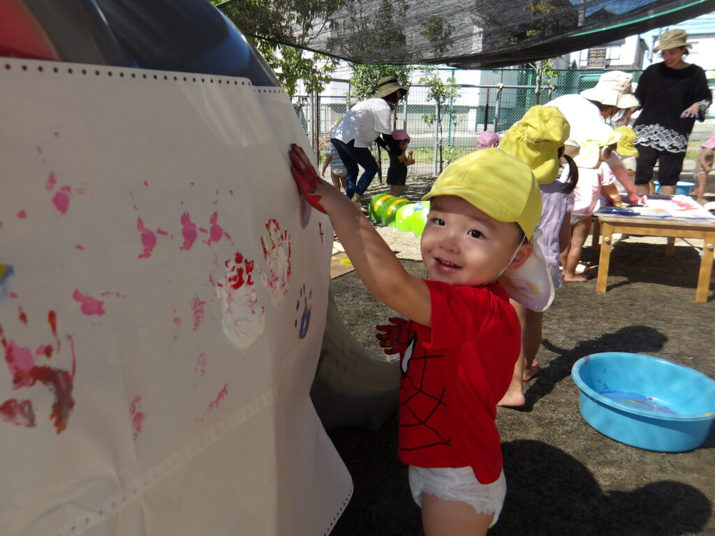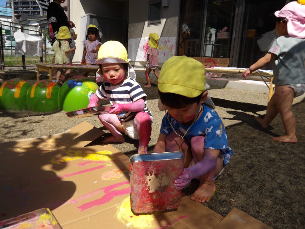 そして、子どもたちも職員も楽しみにしていたボディペインティングも行うことができました!外でダイナミックに絵の具出来るのは今の時期だからこそ!!段ボールや大きな模造紙にみんな伸び伸びと描くことを楽しんでいましたよ♪