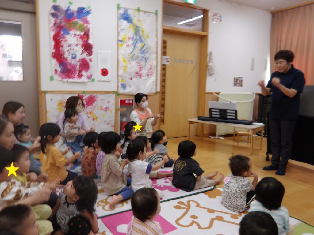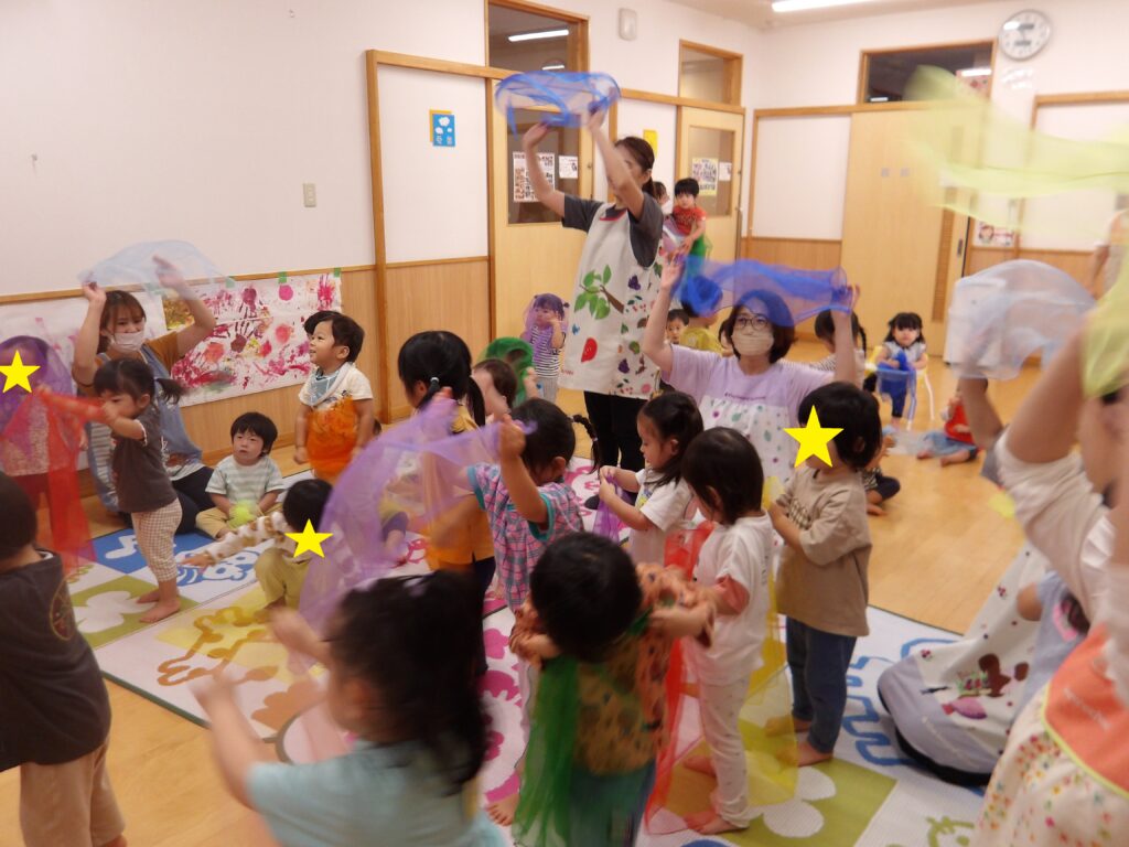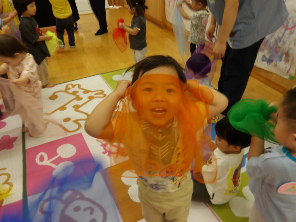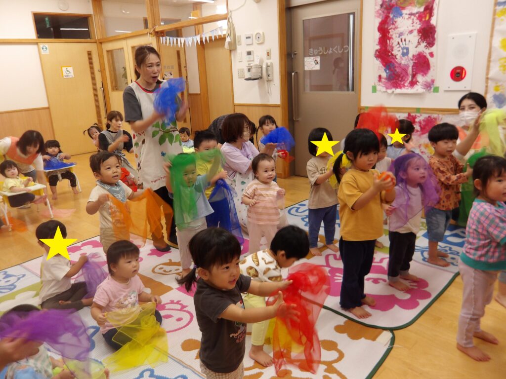 また、先日は「おもちゃばこさん」によるおはなし会がありました!パネルシアターを使ったお楽しみや手遊び、リトミックスカーフを使って遊んだり、身体を動かして遊んだりと、子ども達も目をキラキラ輝かせながら、集中して楽しむ姿が見られました♪