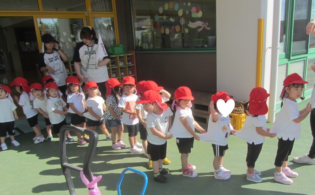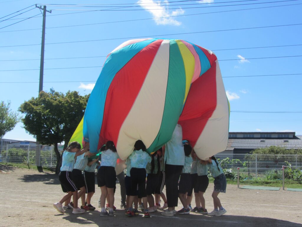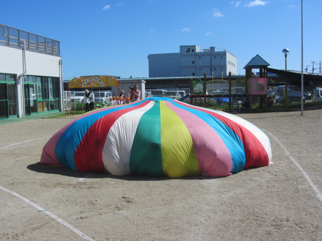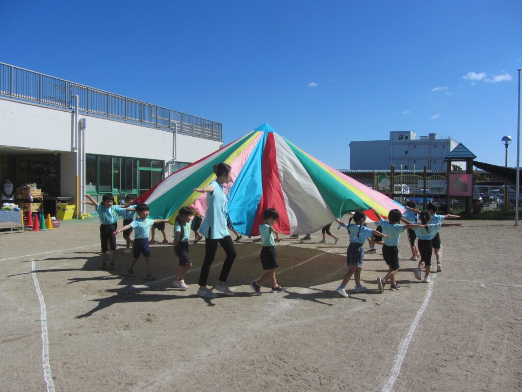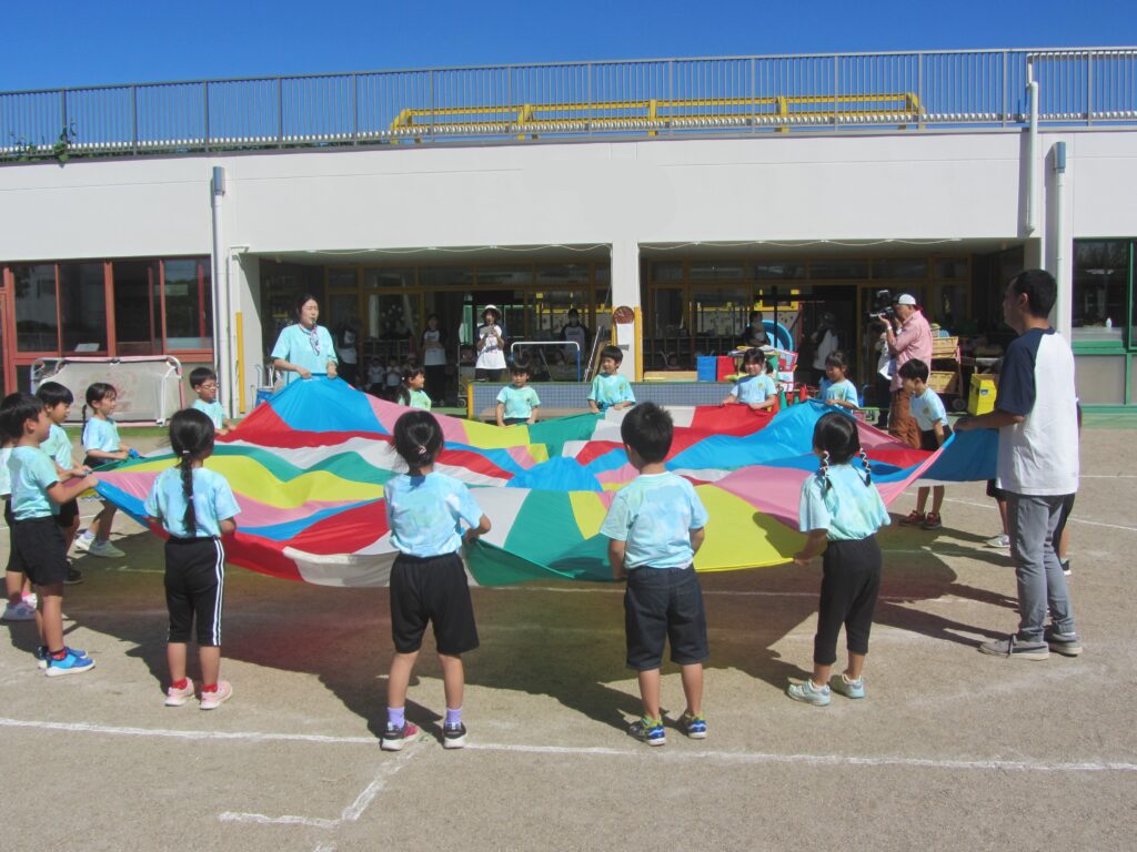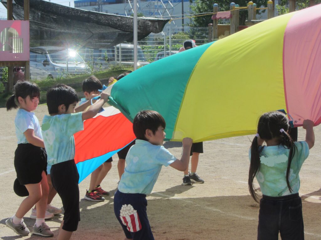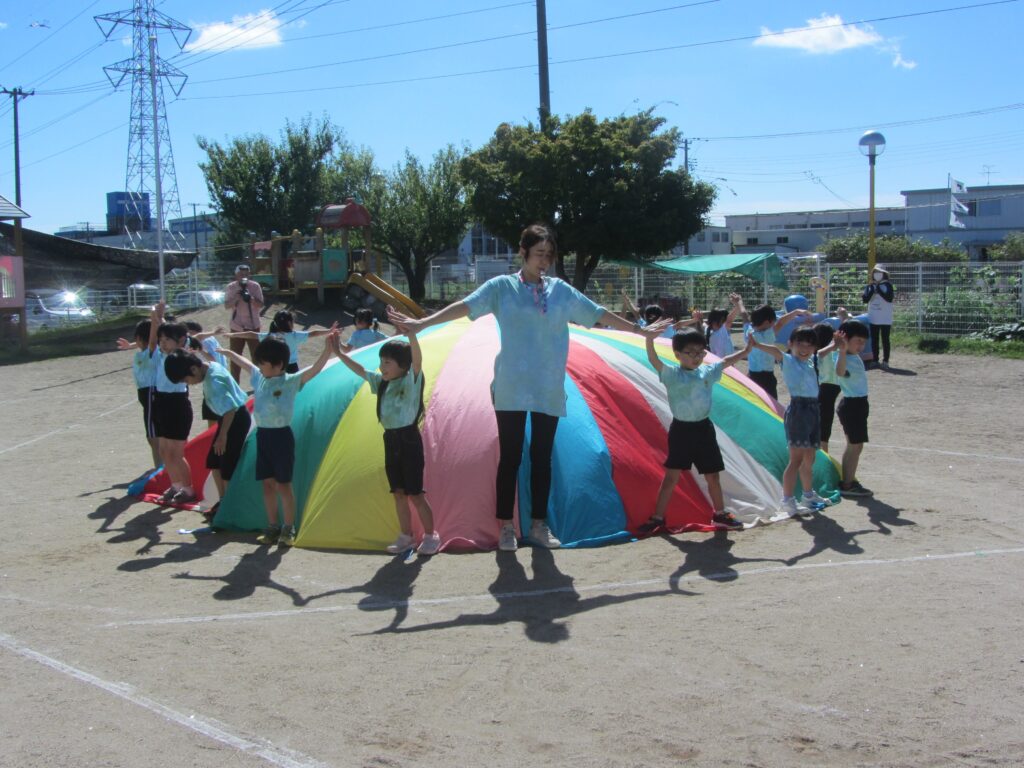 ひまわり組はパラバルーンに挑戦しました。笛の合図で次々と技を披露し、年長らしい素晴らしい姿を見せてくれました。