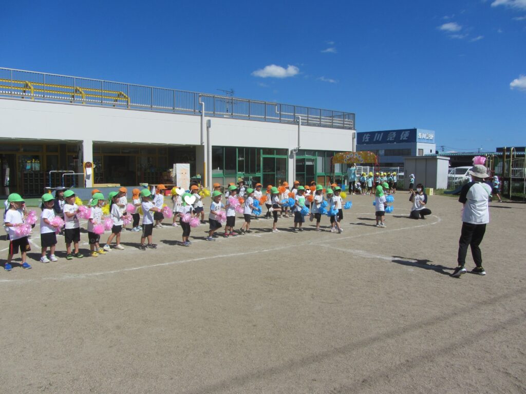 ばら組とゆり組は合同でカラフルなポンポンを持ってリズムを披露しました♪