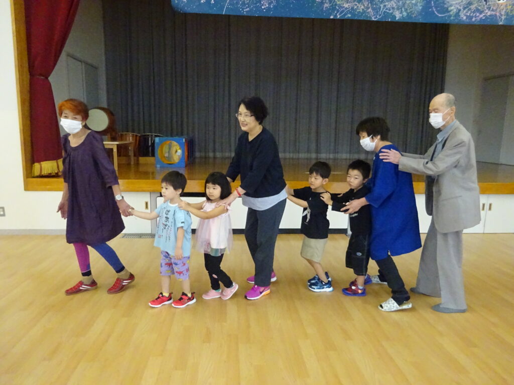 ひまわり組はホールで「かたたたき」「かもつ列車」を楽しみました。初めはかもつ列車を楽しむお孫さんたちの様子を見守っていましたが、担任から「ぜひ一緒に!」とお誘いすると長い長い列車に変身していました。おじいちゃん、おばあちゃんが子どもに戻ったような表情で一緒に楽しんでくださり、楽しい時間となりました。