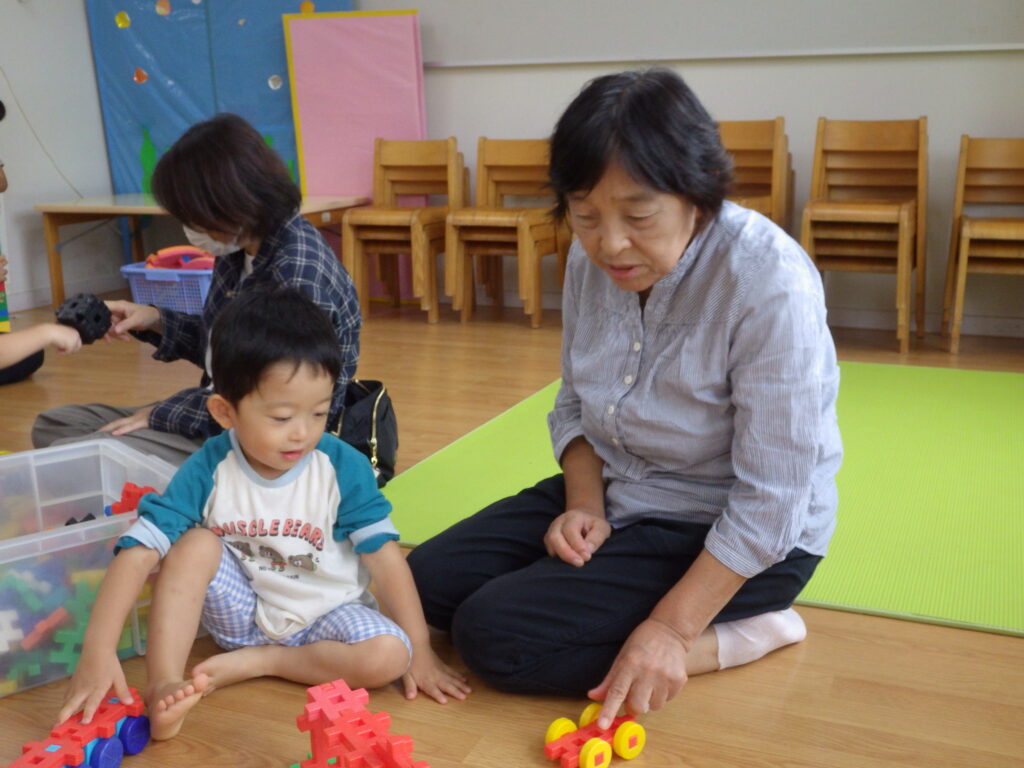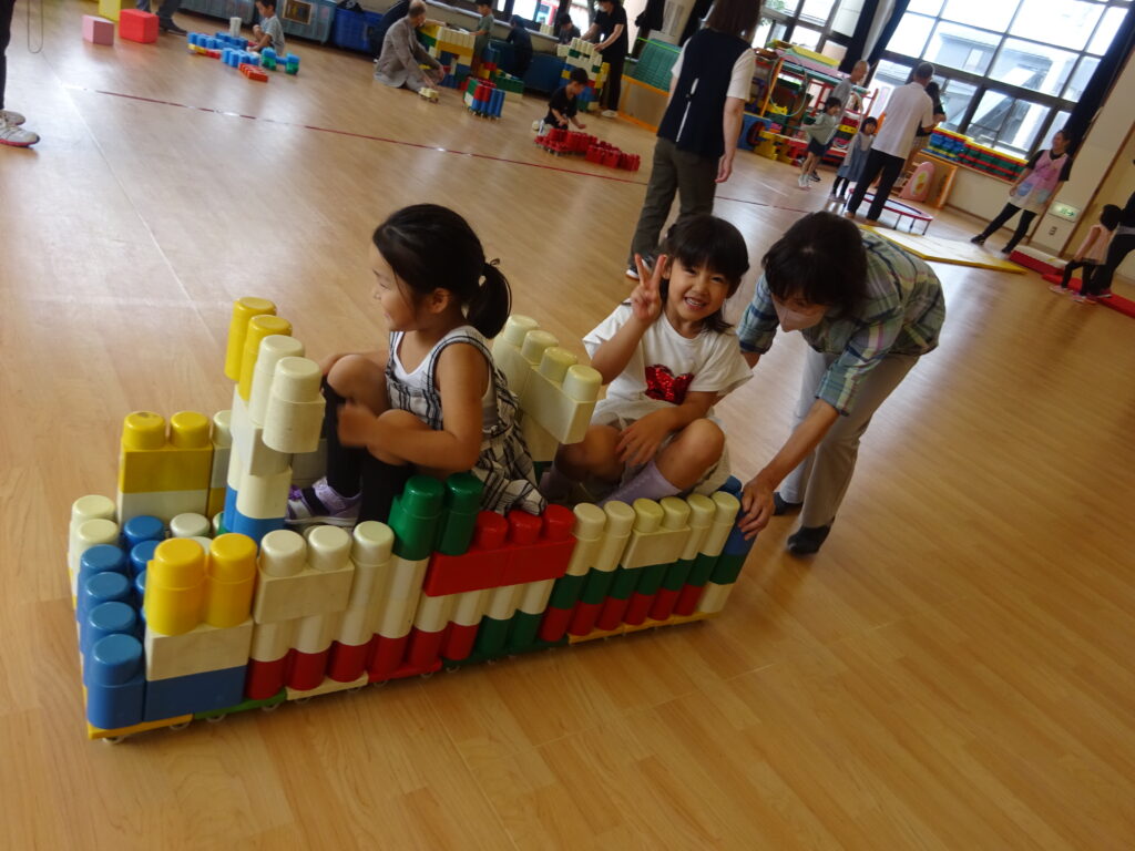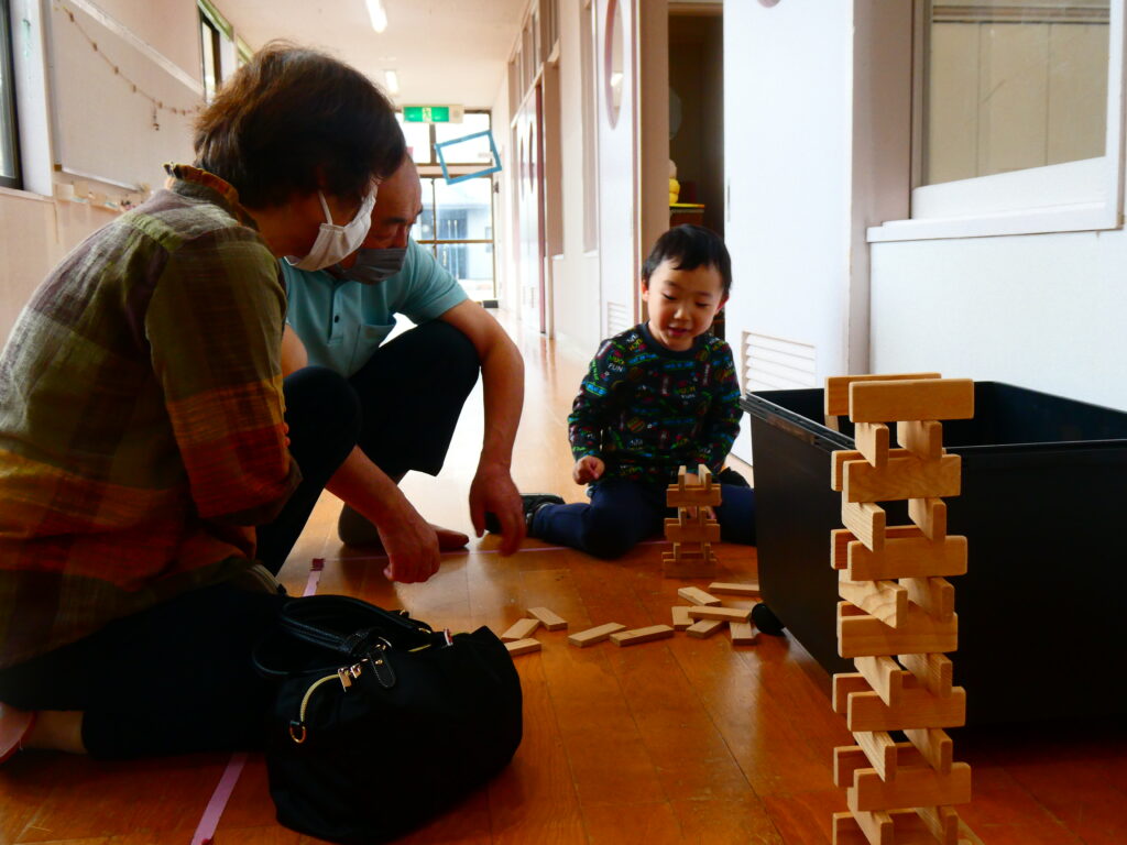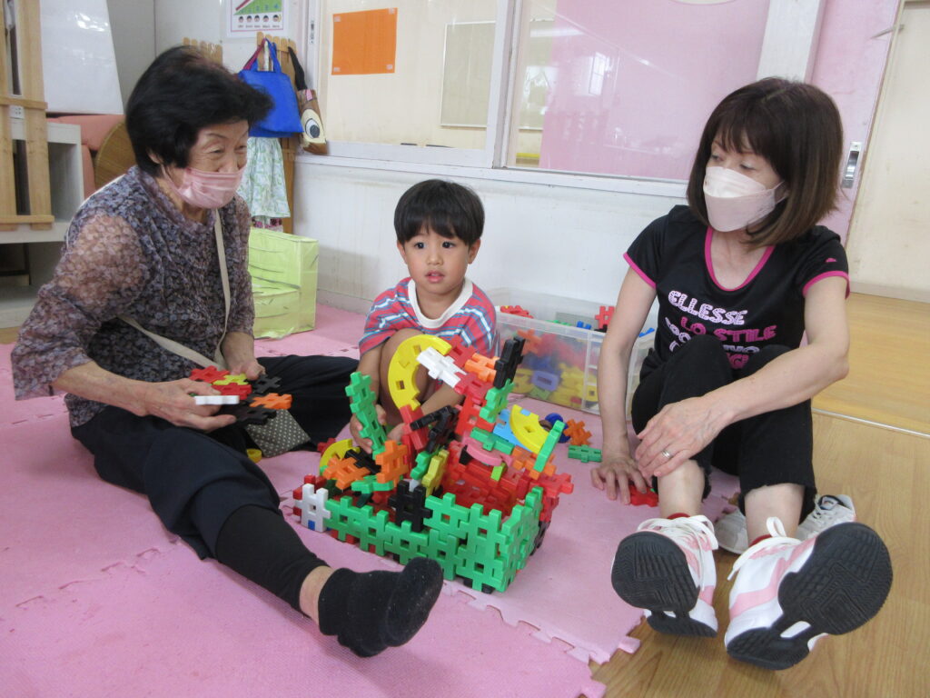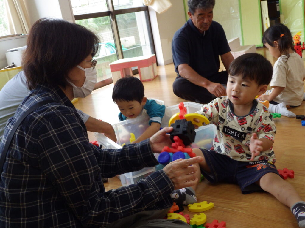 ことり組もおじいちゃん、おばあちゃんのお膝に座って「バスごっこ」をしました。そのあとは室内でジャングルジムにのぼったり、ピアノに触れたりしながら好きな遊びを一緒に楽しみました。積み木を高く積むと「すごい」と拍手してもらい、とびきりの笑顔を見せていました。