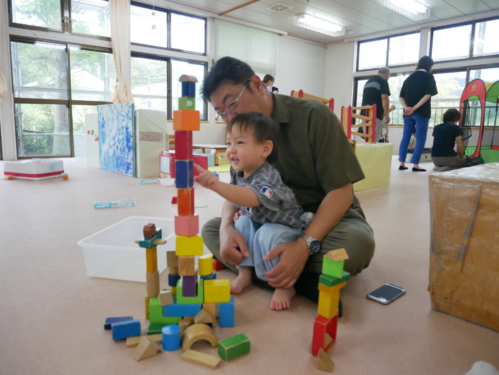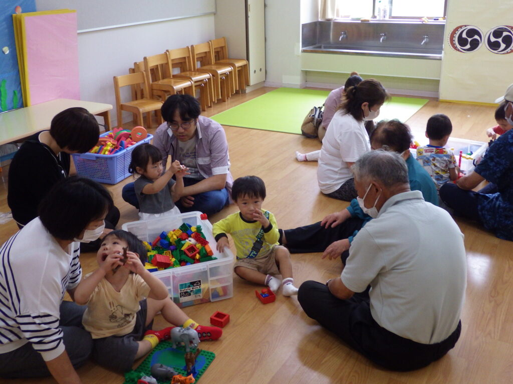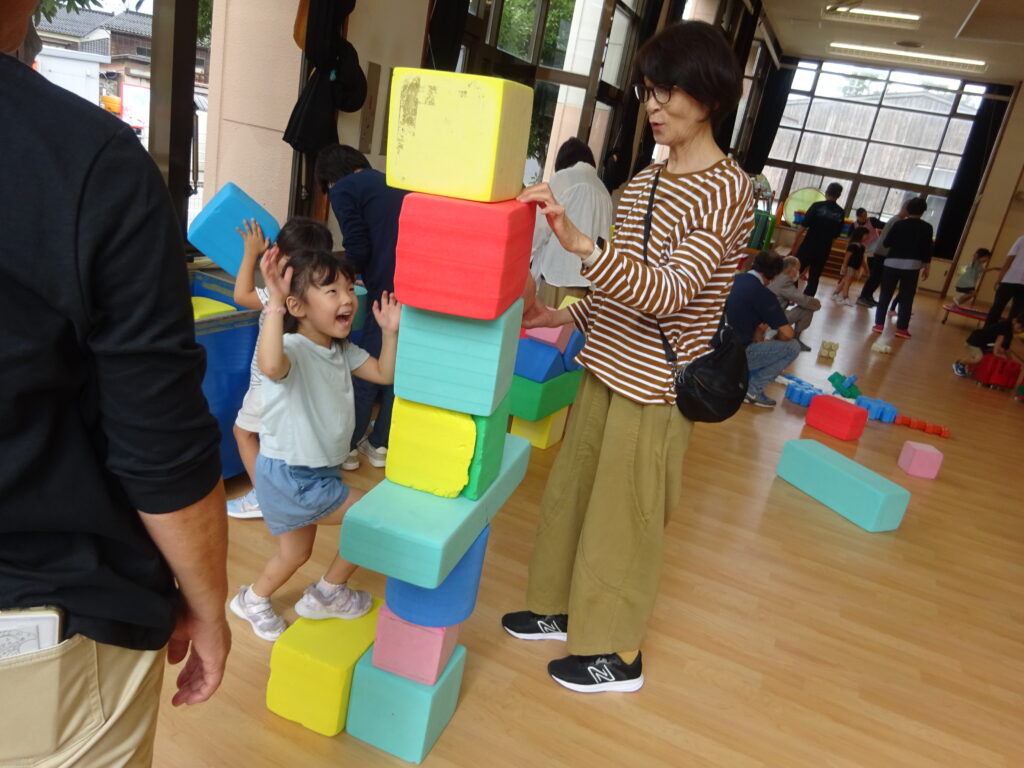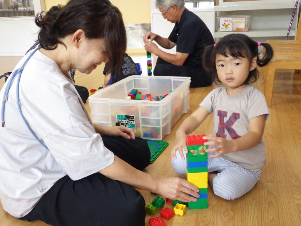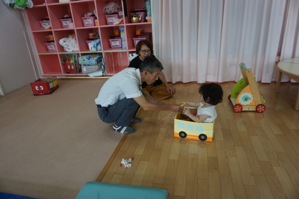ことり組もおじいちゃん、おばあちゃんのお膝に座って「バスごっこ」をしました。そのあとは室内でジャングルジムにのぼったり、ピアノに触れたりしながら好きな遊びを一緒に楽しみました。積み木を高く積むと「すごい」と拍手してもらい、とびきりの笑顔を見せていました。