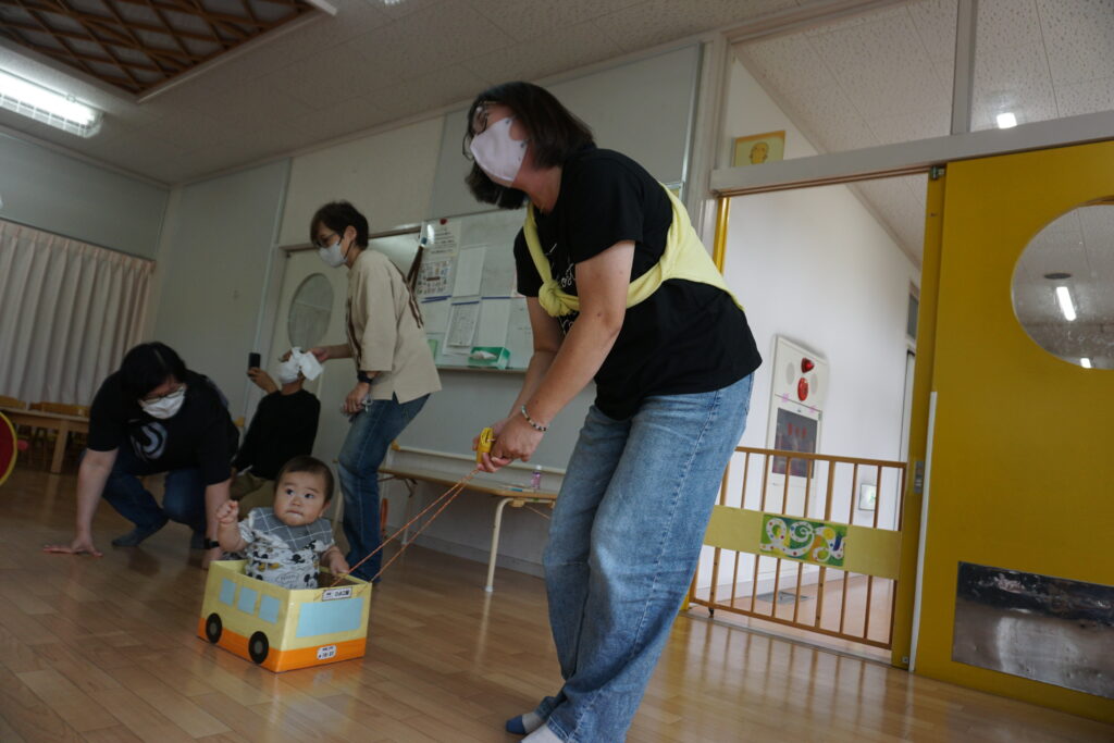 ひよこ組はまのっこわくわくフェスティバルでも行った大好きな「バスごっこ」をしました。そのあとは室内で手作りのバスに乗ったり、音楽に合わせて一緒に体を揺らしたりと嬉しそうな子どもたちでした。