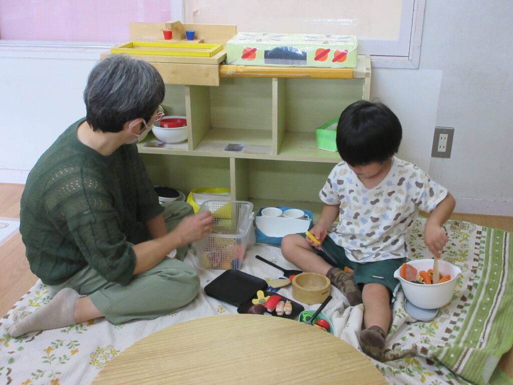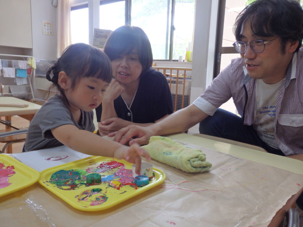 こりす組は「かたたたき」をしてスキンシップを楽しみ、2部屋に分かれて好きな遊びを楽しみました。画用紙にペタペタとスタンプを押したり、筆を使って塗ったりなど一緒に作ることを楽しんでいました。またお気に入りの絵本を子どもたちが代わりに読んだり「よんで~」と甘える姿がほほえましかったです。