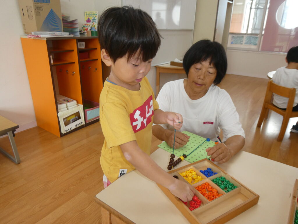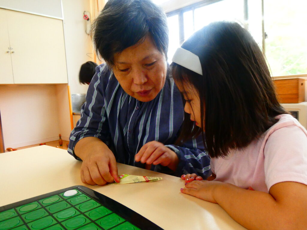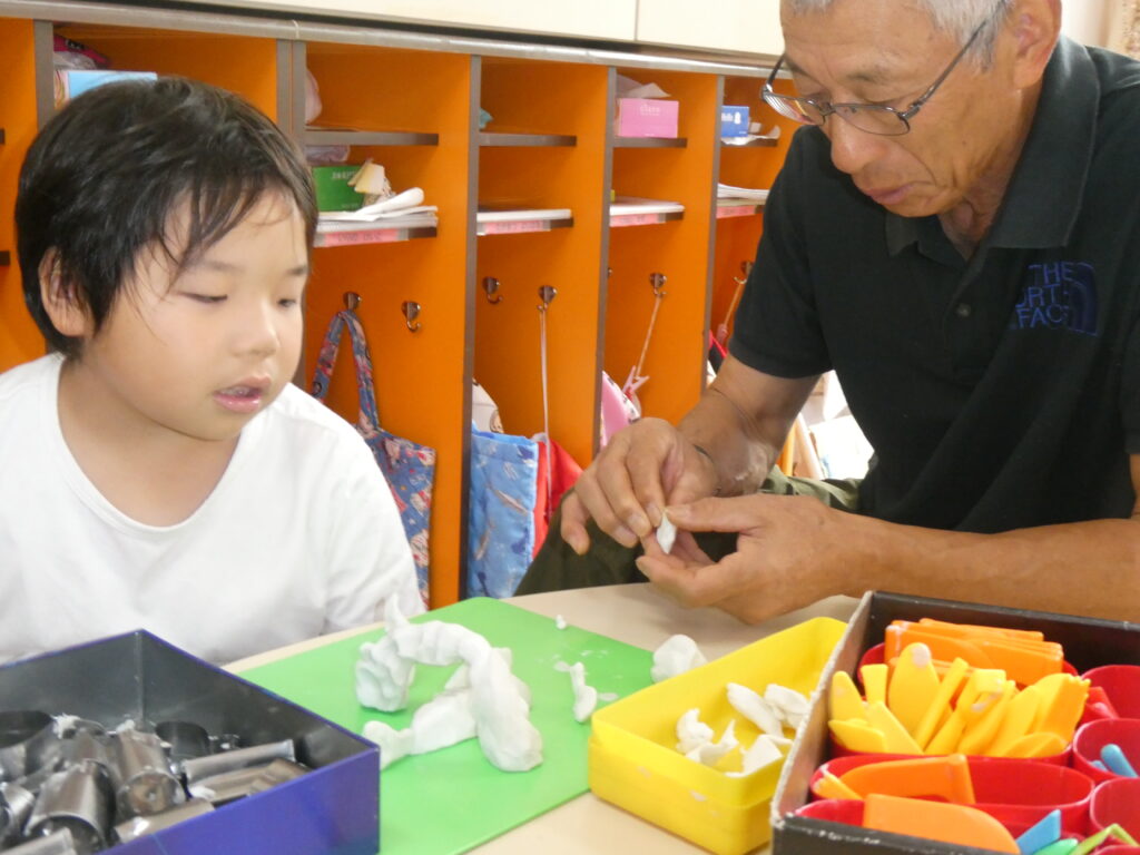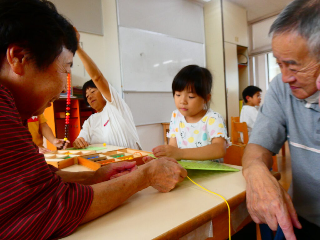 ばら組さんは「かたたたき」をしました。やはり肩をめがけてちょうどいい力でトントンしてくれるので、気持ちよさそうに嬉しそうにするおじいちゃん、おばあちゃんの表情が印象的です。そのあとは好きな遊びに誘って一緒に紙飛行機を飛ばしたり、ビーズを通してオリジナルのネックレスづくりを楽しんだりと子どもたちはとても嬉しそうでした。
