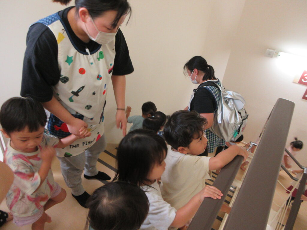 道路を渡って違う施設への避難に、子ども達はそわそわと緊張した様子でした。階段を使って3階まであがることは、子ども達にとっては一苦労。一歩一歩慎重に上っていました。