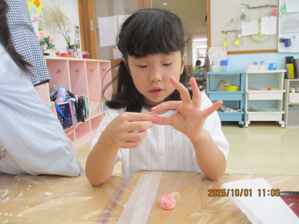 小麦粉、食紅を使ってお月見の団子作りをしました。