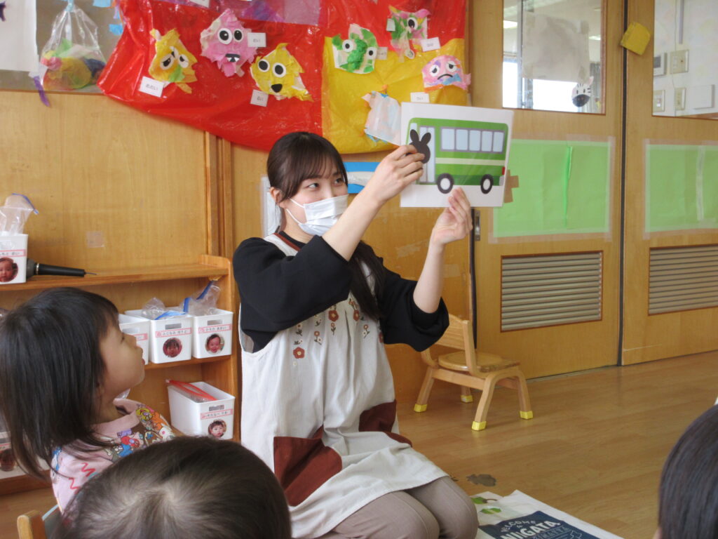 先生からの出し物では、不思議なバスが登場!バスの中にたくさん乗り込み、何が出てくるかな~?と興味深々の子どもたち。うさぎや恐竜が出てきたり・・・
