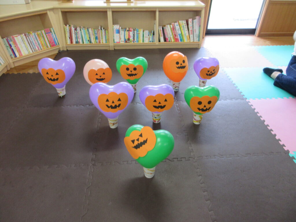 出来上がったかぼちゃの風船を使って、タッチやキック!