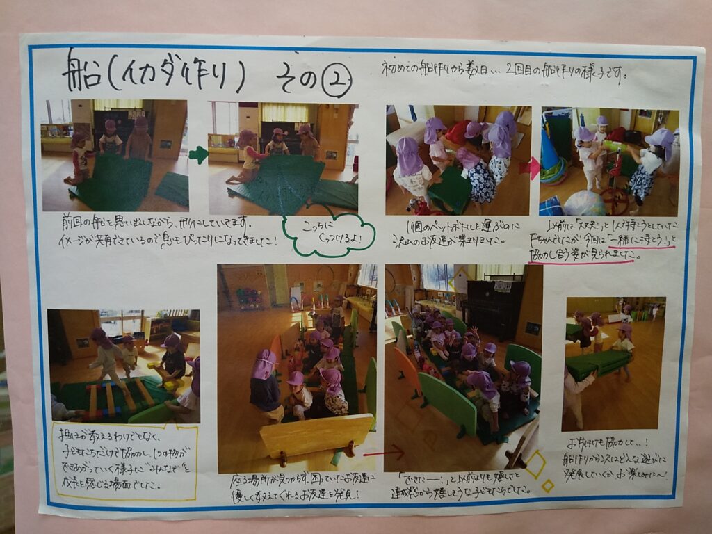 毎回同じシチュエーションとはならず、お友達と意見が合わなくて言葉で伝え合う姿から、協力し合う姿に変わっていくなど3歳児さんならではの姿が見られます。