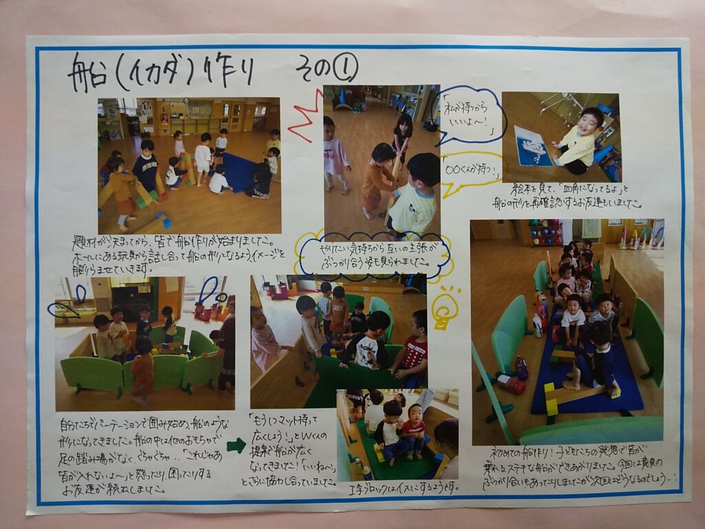 そして楽しい船作りが始まりました!まだまだ自己主張が多い年齢でもある中で、アイディアを出し合いながら少しずつ船ができあがっていきました。