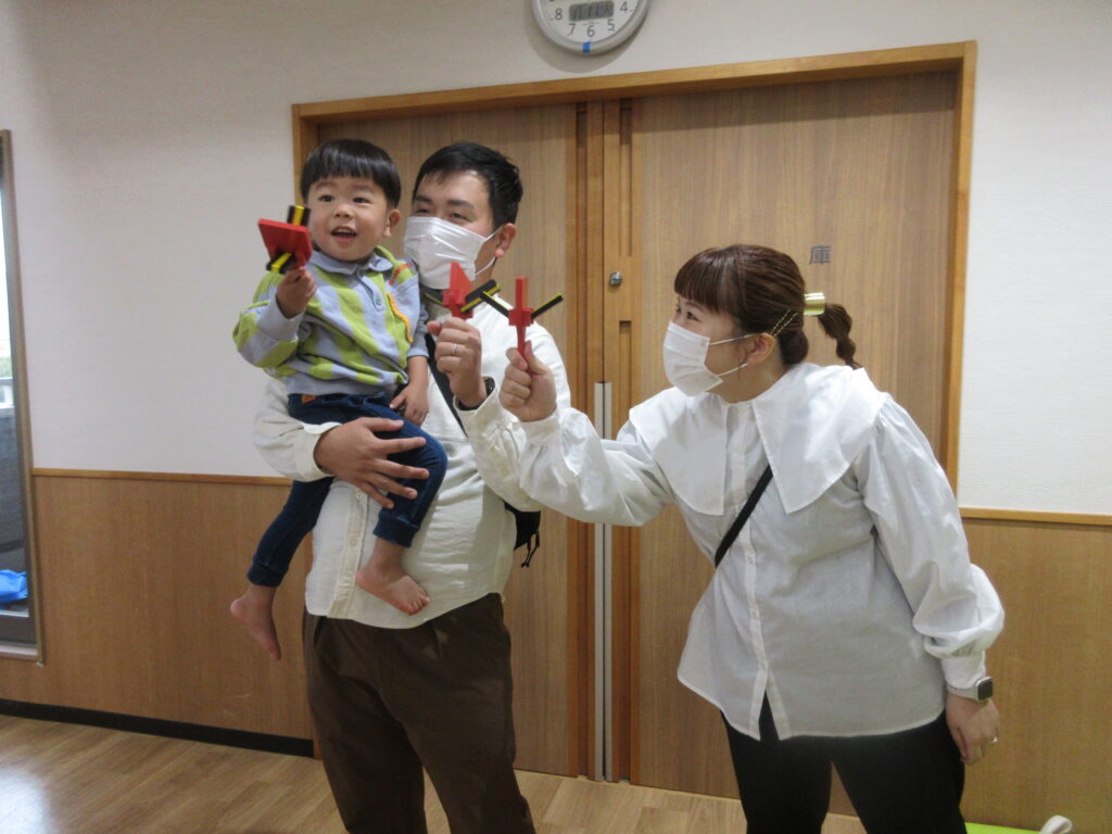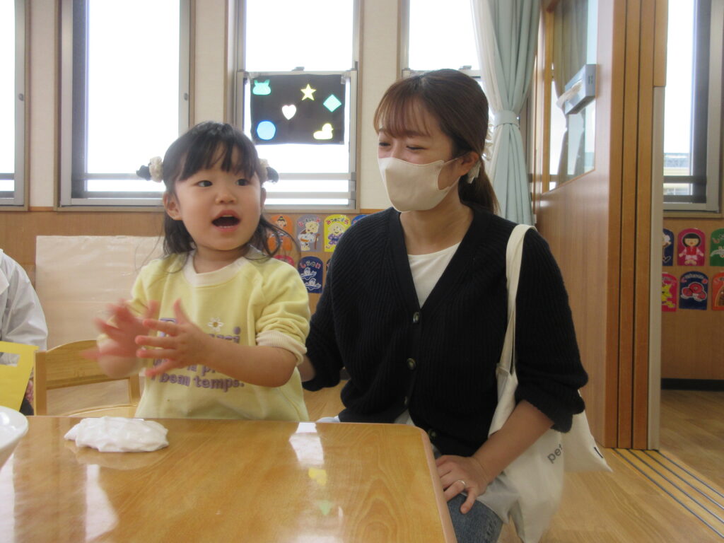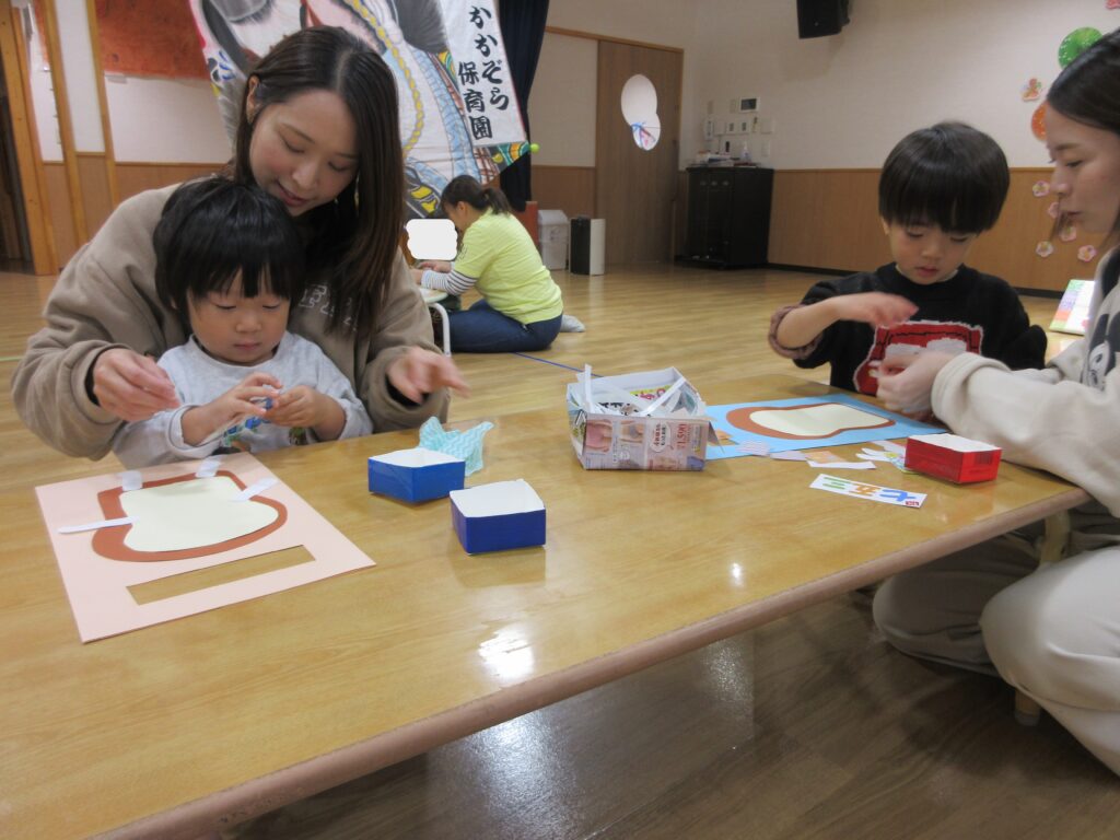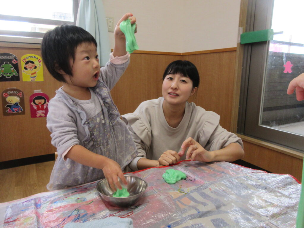 ニュース&トピックス 白根おおぞら保育園 わかば組🍃保育参加がありました🌟【白根おおぞら保育園】 掲載日2025.11.11 カテゴリー保育園 本日は保育参加に参加していただきありがとうございました😊 いつもと違う雰囲気で緊張しながらも、大好きなおやつを食べて良い笑顔でスタート!😆🌟 「またスライムしたい!」「次いつするの?」と待ち遠しかったスライム遊びをお家の方と一緒に楽しみました💚 カラーバリエーションも前回よりも増やし、自分なりにイメージしたものを作っていました💭🌈 伸びたり、丸まったり、切れたり…様々な形に変わるのが面白くて、夢中になって遊ぶ姿が微笑ましかったです🎵 「プニプニ~」「ちょっと冷たい~」など様々な感触があるのも楽しいポイントですね👌 普段楽しんでいる遊びを、お家の方と楽しむことで「こんな遊びが好きなんだ!」や「連絡帳や口頭では聞いていたがこんなゲームなんだ!」と新しい発見に繋がることができて良かったです◎ 遊戯室では七五三の制作コーナーを設けました✂ 苦手なレーズンもパンどろぼうの絵本を見てから食べられるようになった子が何人もいるくらい、大のパンどろぼうブームなわかば組さん🍞 「何味のパンにしようかな~」と一人一人思いのこもった可愛い作品ができました💓 「だるまさんに服を着せてあげよう~」とデザイナーさんもいて、かわいかったです👘 「指先が器用になってる!」「手が汚れるの嫌じゃなくなってる!」などお家の方と一緒にお子さんの成長を感じる事ができるいい機会になって良かったです💛 最後はみんなで身体を動かして遊びました💃 ハイハイレースや👶 親子でペンギンレース🐧みんなで身体を動かすと自然に笑顔が増え、場が和みますね🌼これからも指先を使った遊びや沢山身体を動かして元気に遊びたいと思います!本日はありがとうございました!