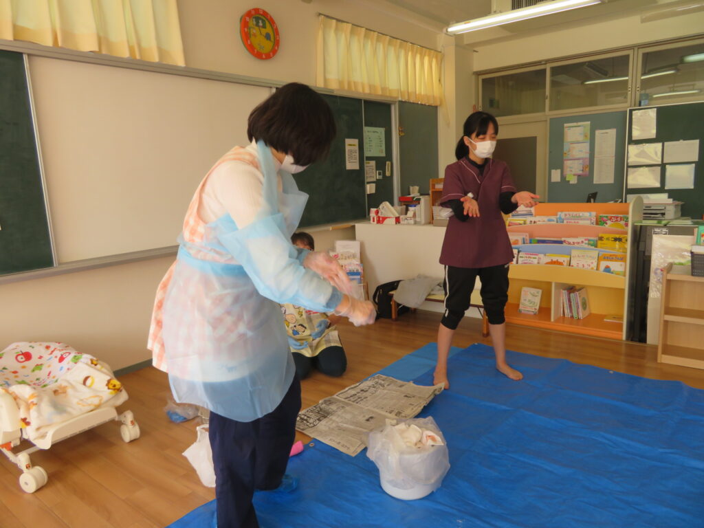 嘔吐処理の仕方については、職員が実演を行い、先生より手順に沿って説明をしていただきました。