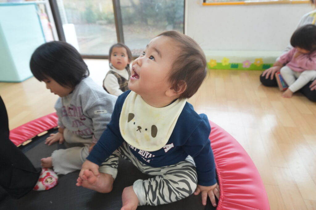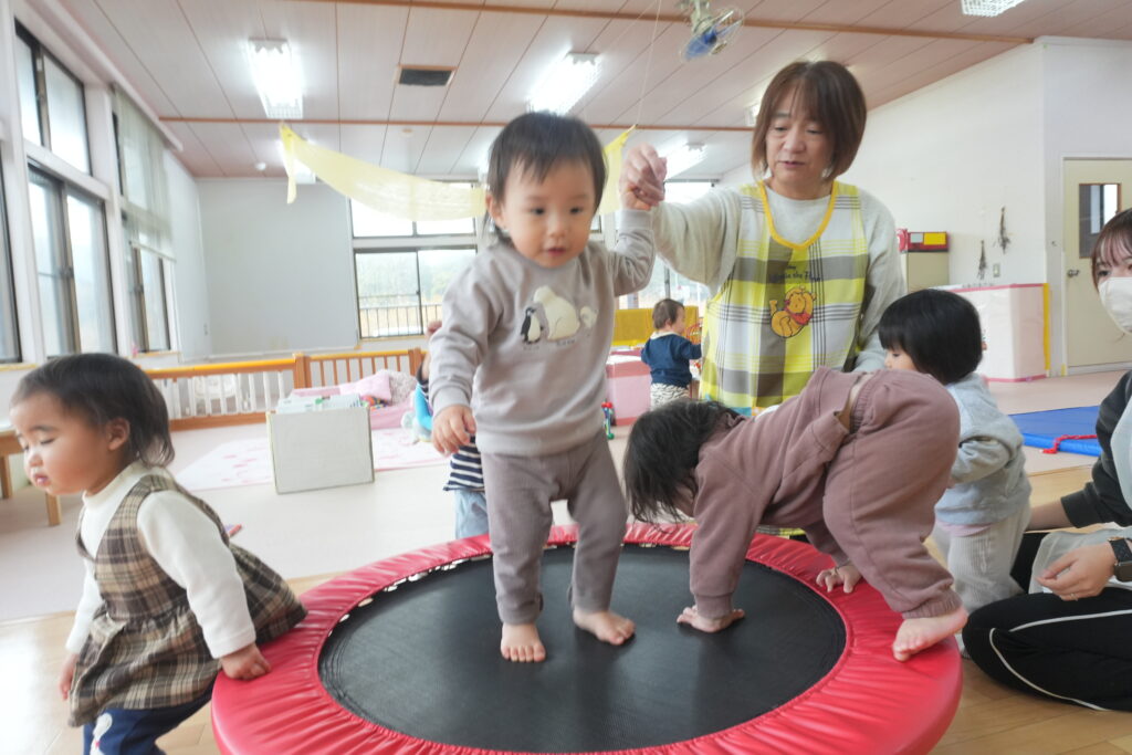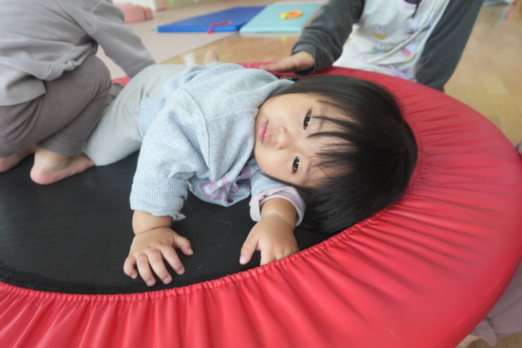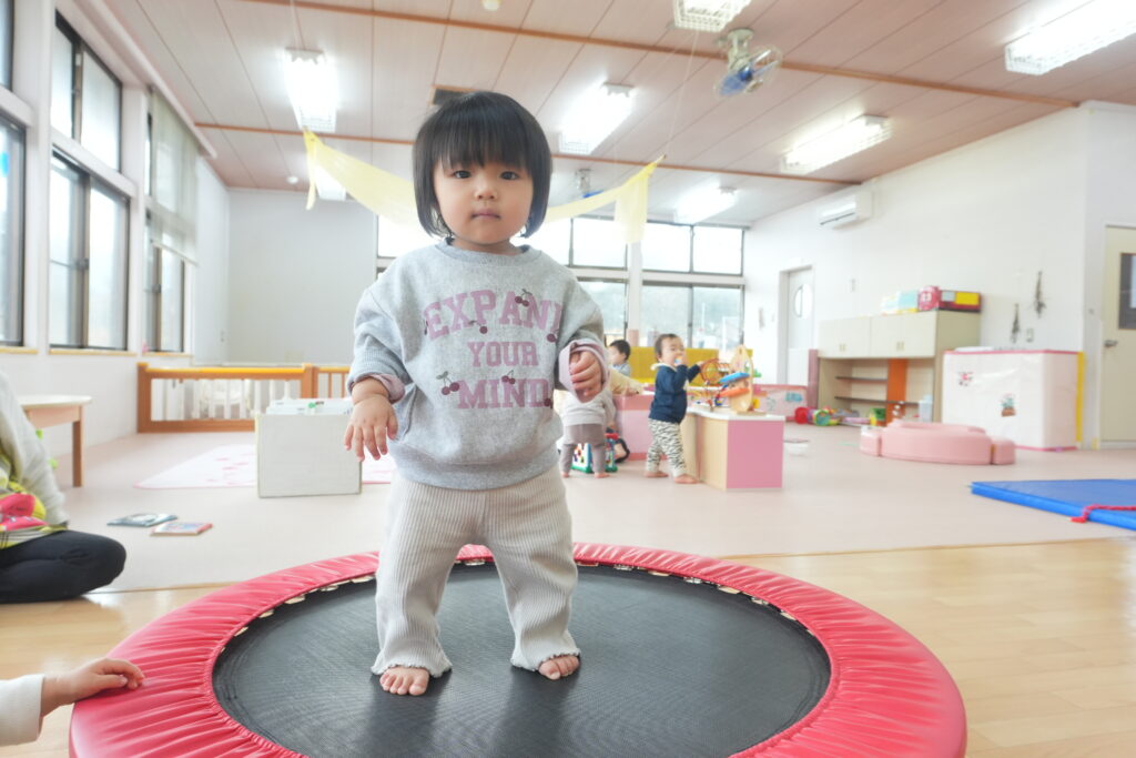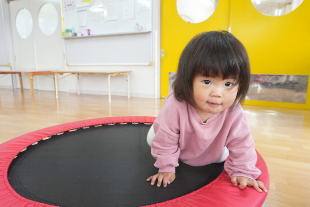 雨が降り戸外遊びができない日にはお部屋やホールで遊んでいます。この日はお部屋にトランポリンを持ってきて遊びました。トランポリンを置くと興味津々な様子で近付く子どもたち。保育者がお手本でジャンプして見せると、真似をしてジャンプしようとしたり座って揺られたりして楽しんでいました♪