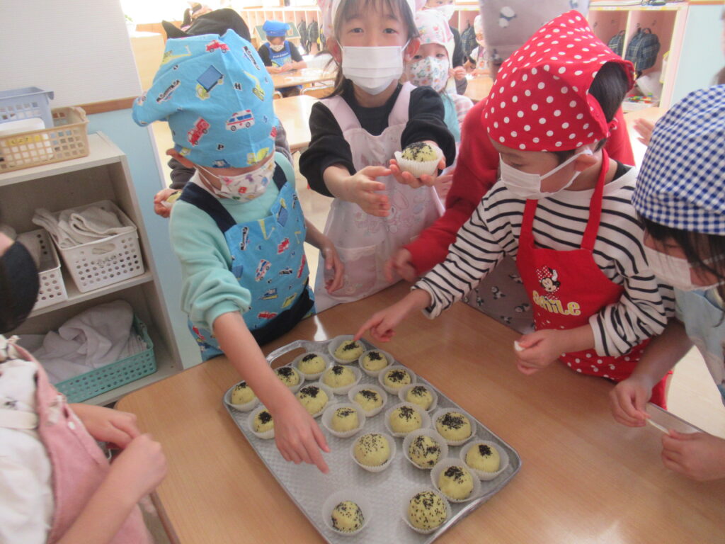 給食の先生がオーブンで焼いてくれます。おやつが楽しみだね!