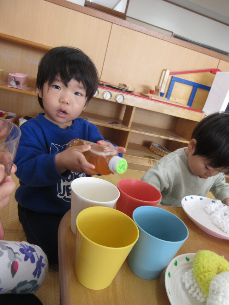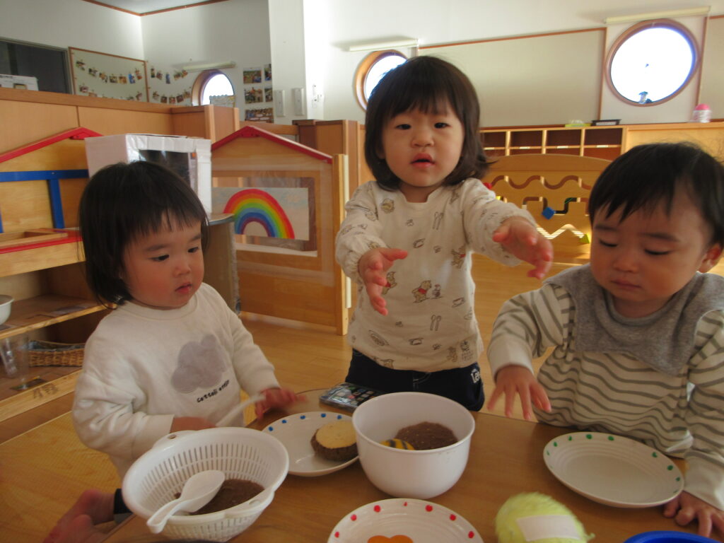 朝はめばえ組さんと一緒に過ごしています。同じ食卓を囲むと「どうぞ~」とお料理を渡す姿も見られ微笑ましかったです。