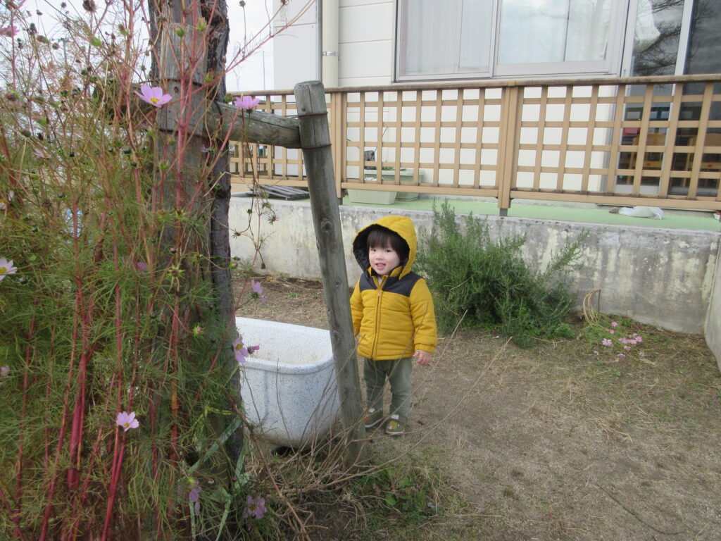 木の陰に隠れているお友だち発見‼コスモスが気になったのかな?