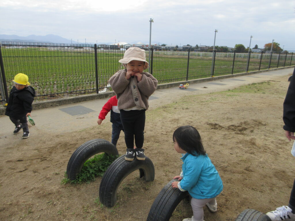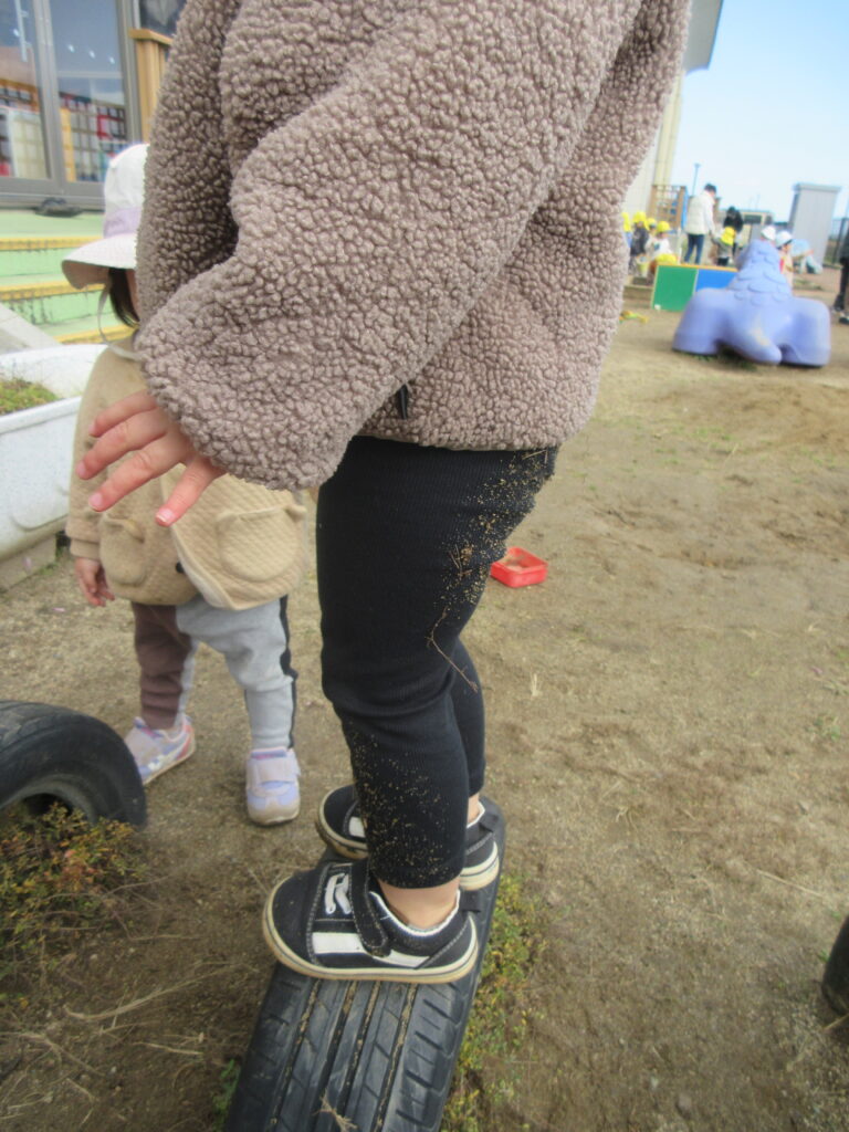 こちらでは【タイヤ渡り】に挑戦中の子どもたち🚙
