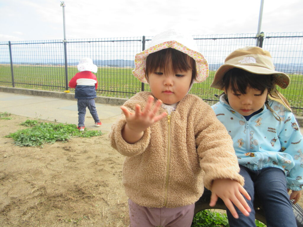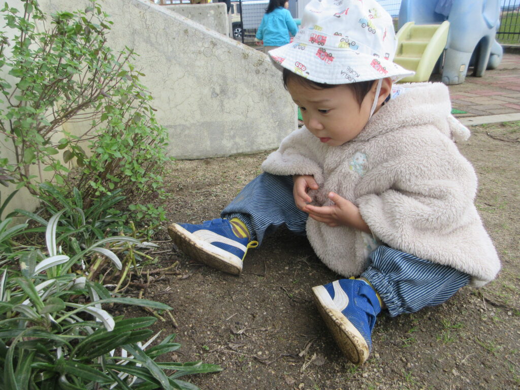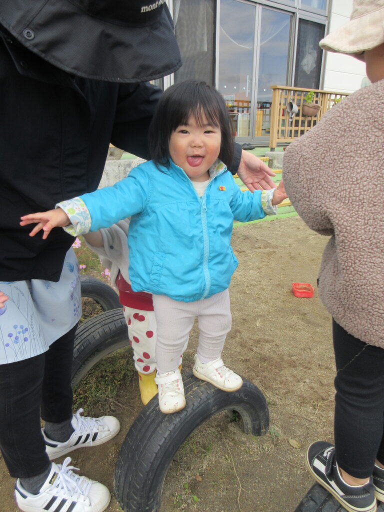 保育者が木の陰から「み~つけた!」と声をかけると反応が楽しいようでにこにこ笑っていました。