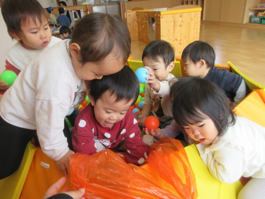 まずは保育者がふわ~~~んと袋を投げると、いろんな方向にひらひら動く動きに大笑い😁キャッチしようと一生懸命ついてく姿に保育者も「がんばれ~~」と応援したくなりました✊