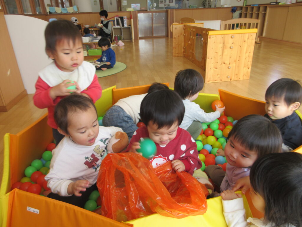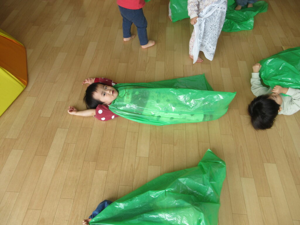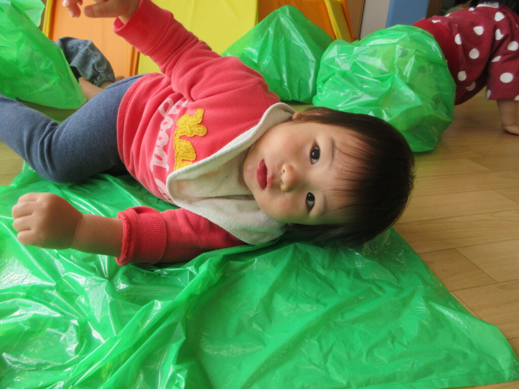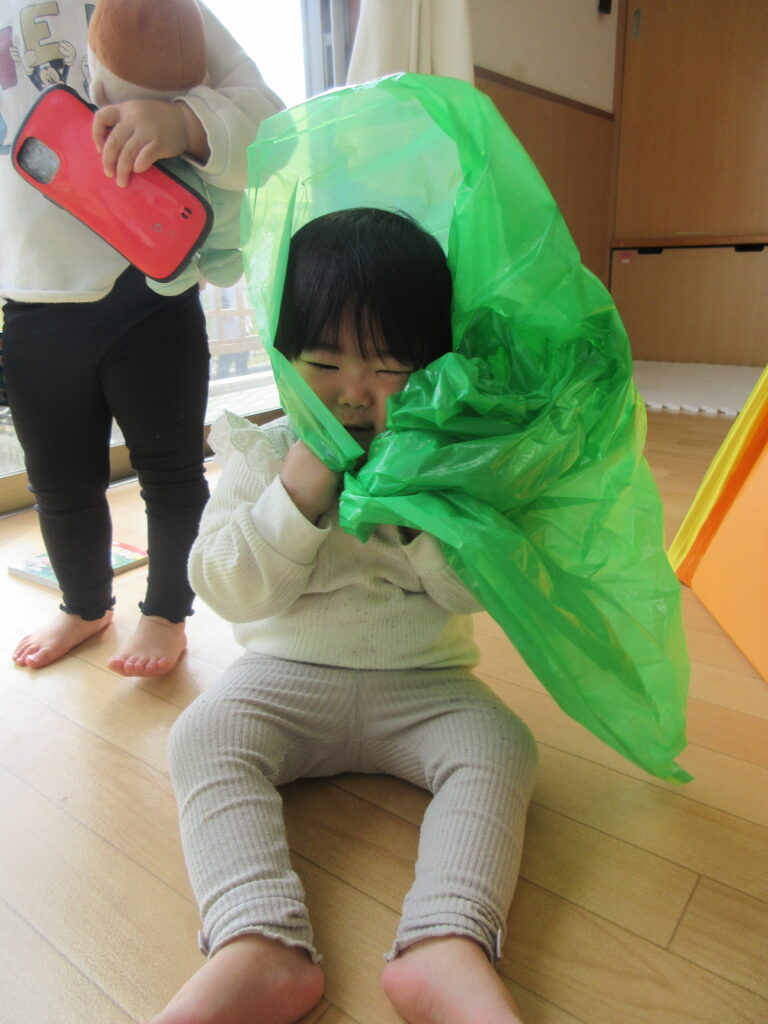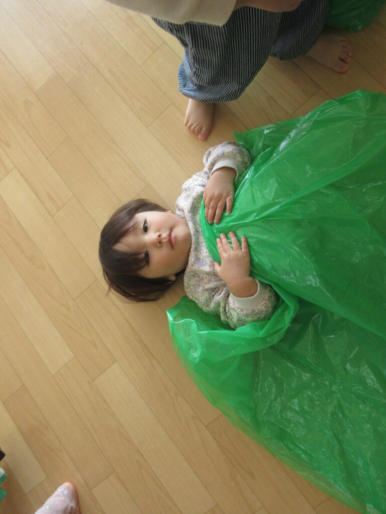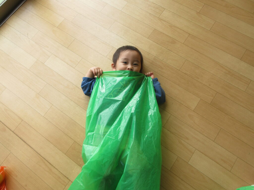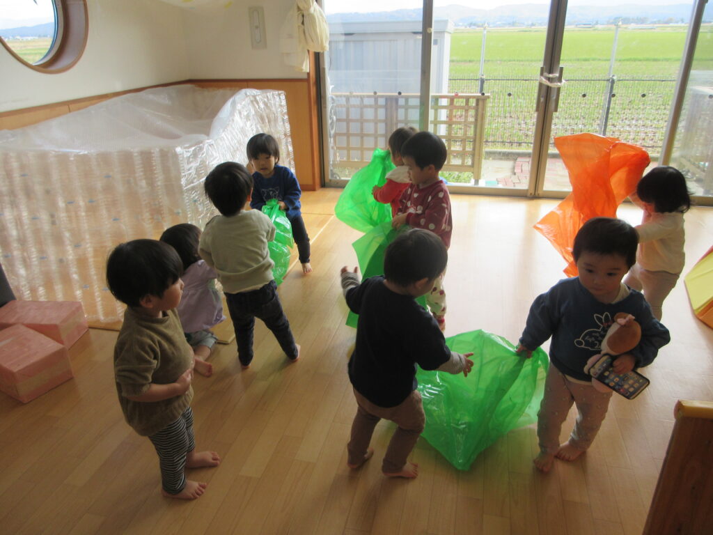 この遊びが【楽しい】と感じたようなのでたくさんポリ袋を出してみました。写真を撮り忘れてしまいましたが、バルーンのようにしてバサバサするお友だちもいました。
