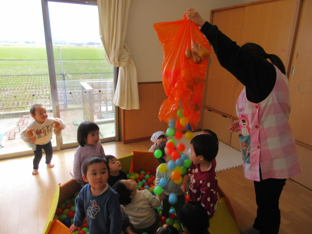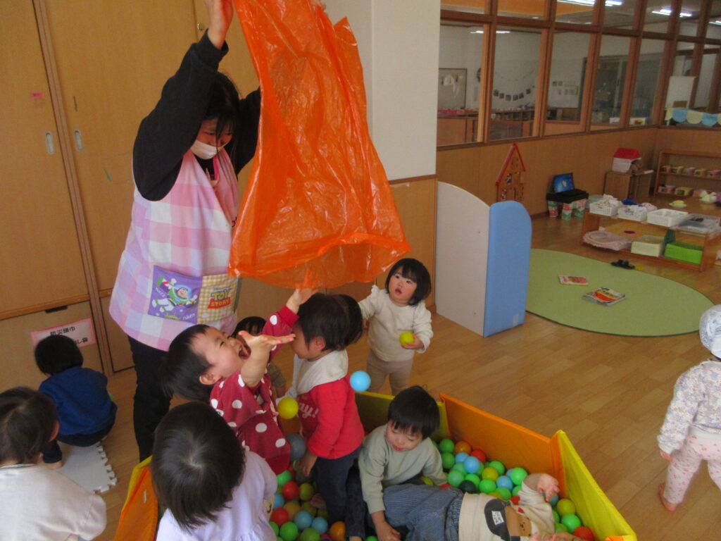 子どもたちの声からヒントを得て、ボールを雨に見立てて遊んでみました。