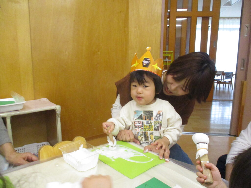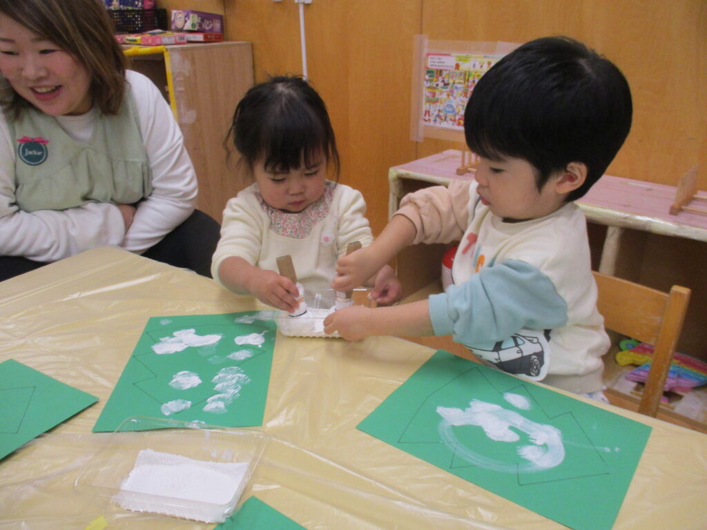 ちゅうりっぷ組さんは、ポンポンでクリスマスツリーに雪の模様をつけました。上手にポンポンを持って、楽しそうにペタペタ押していました。