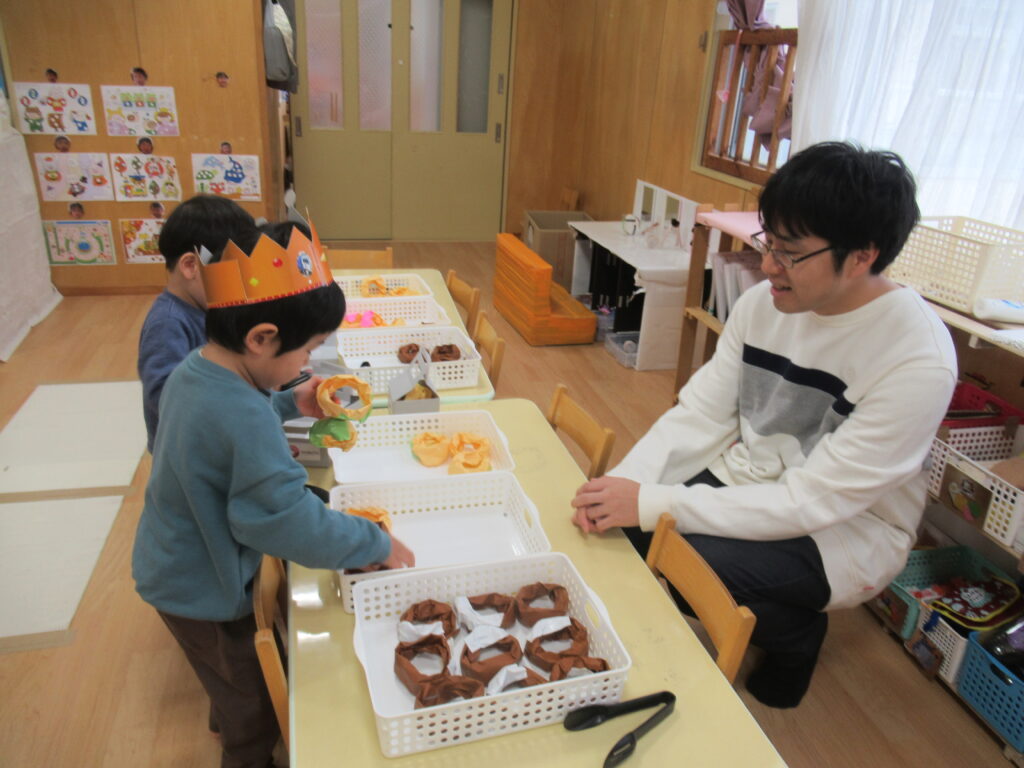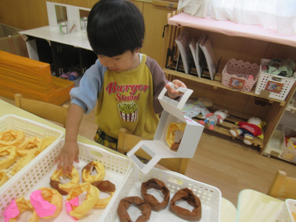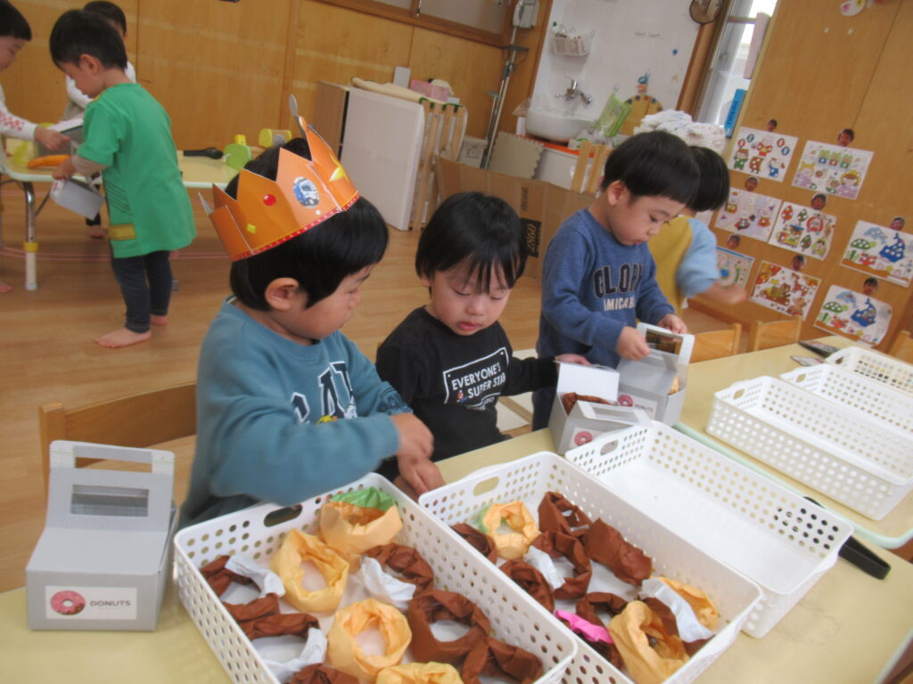 たんぽぽ組さんは、ドーナツ屋さんが開店しました。みんなおいしそうで、どれにしようか迷っちゃう!