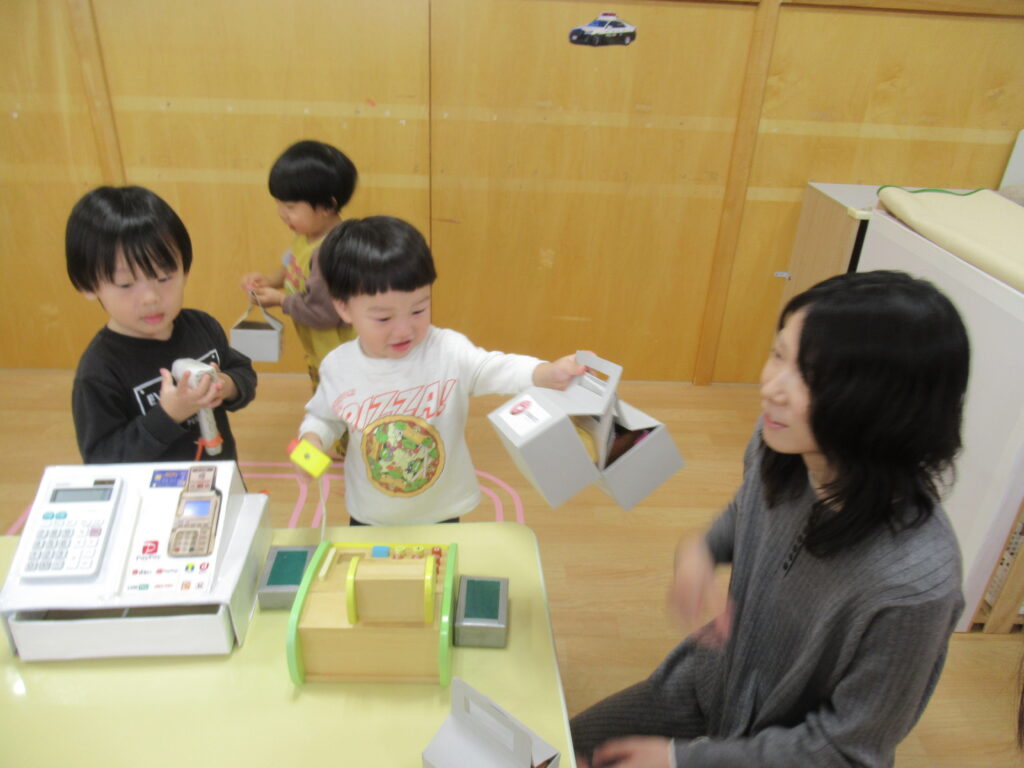 店員さんになり、お父さんから注文を受けます。お父さんがネットから注文しようとすると、「電話してください」とお願いしていました。楽しいやりとりですね😄。