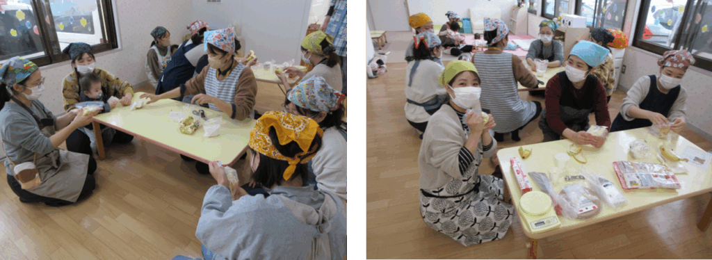 簡単な調理方法でおいしいおやつをお母さんたちと一緒に作りました♪