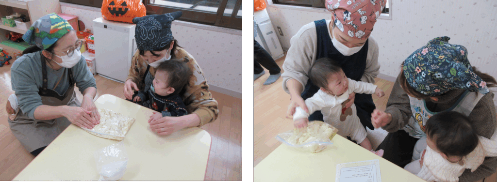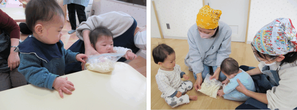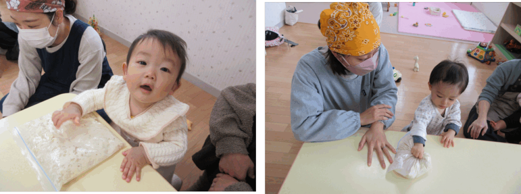 お子さんもお手伝いしてくれました♪感触が気になったようで、ぶにゅ!とにぎったりツンツンしながら感触遊びを楽しんでいました。