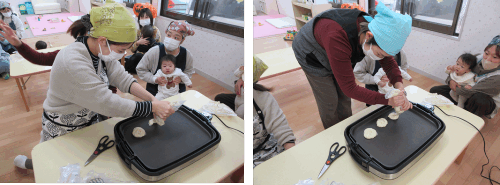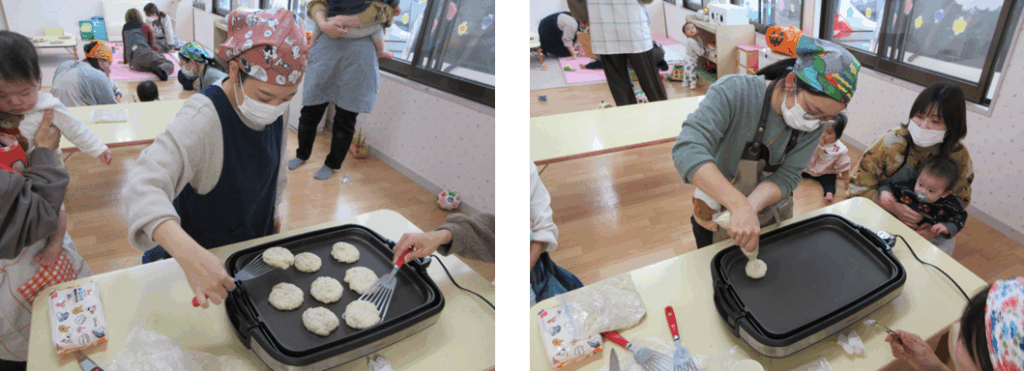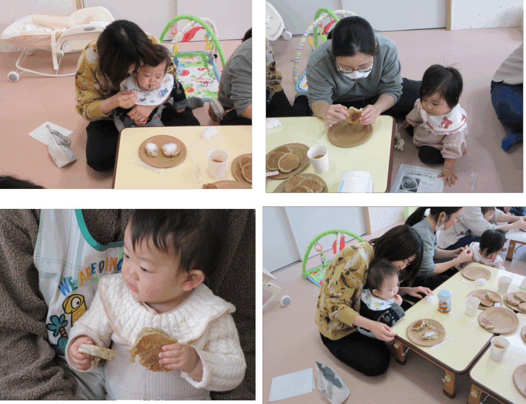佐渡市の栄養士さんをお招きし、離乳食講座を開催しました。今回は実際にお母さんたちがおやつを作れたらいいなという思いから、『豆腐バナナパンケーキ』を作りました♪