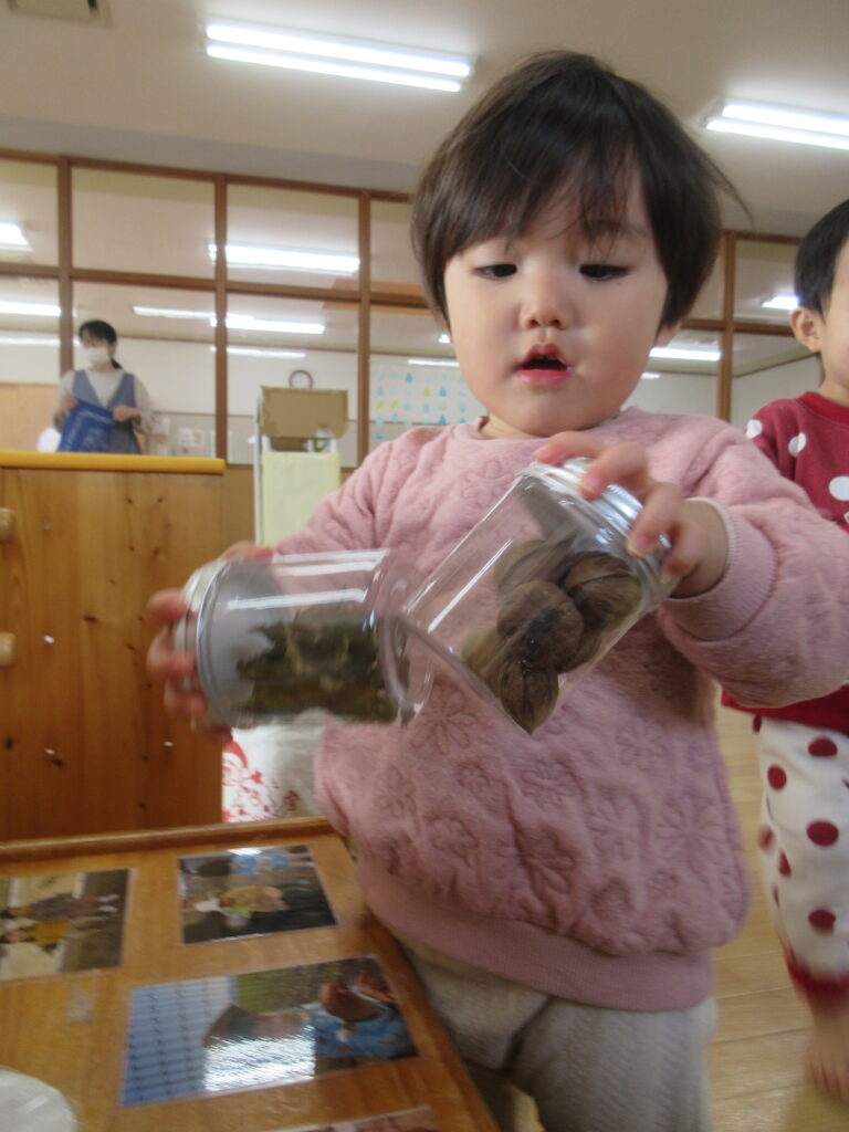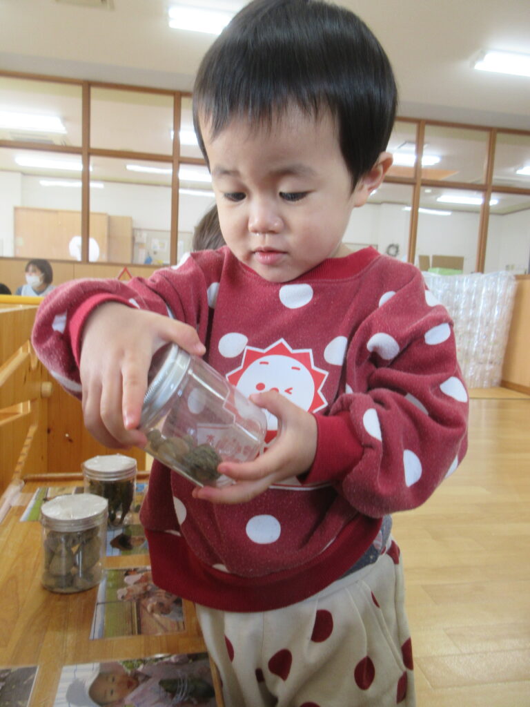 石の容器は他の容器よりも少し重くて「こっちはおもた~~い」と重さの違いに気づくお友だちもいました。