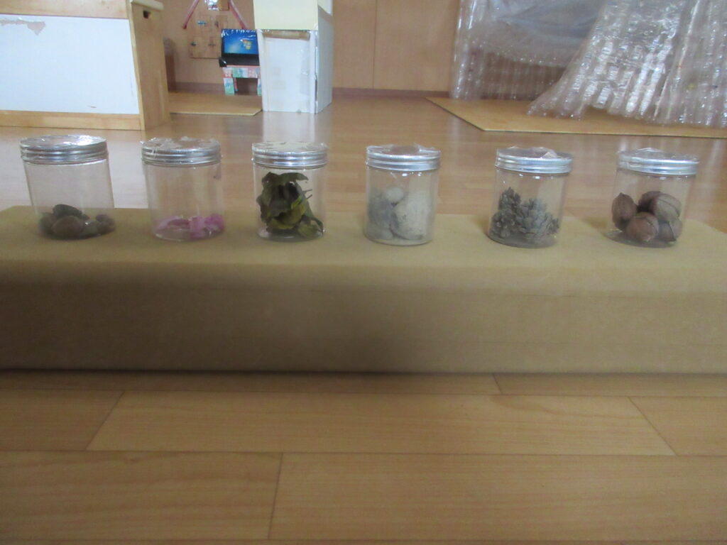 今回は左からどんぐり・コスモスの花びら・葉っぱ・石・松ぼっくりを見つけました♪ ※くるみは先生が拾ったものです。