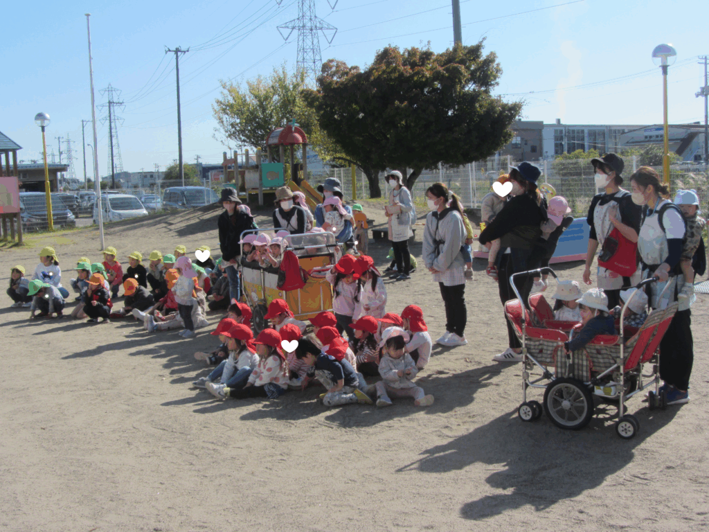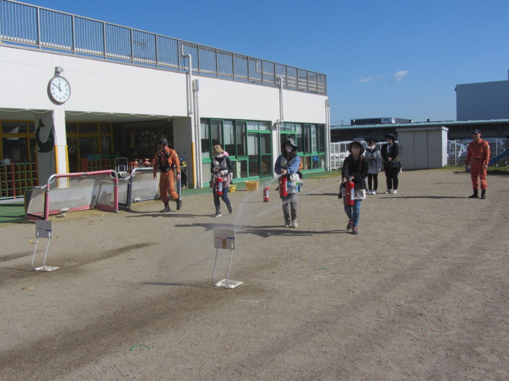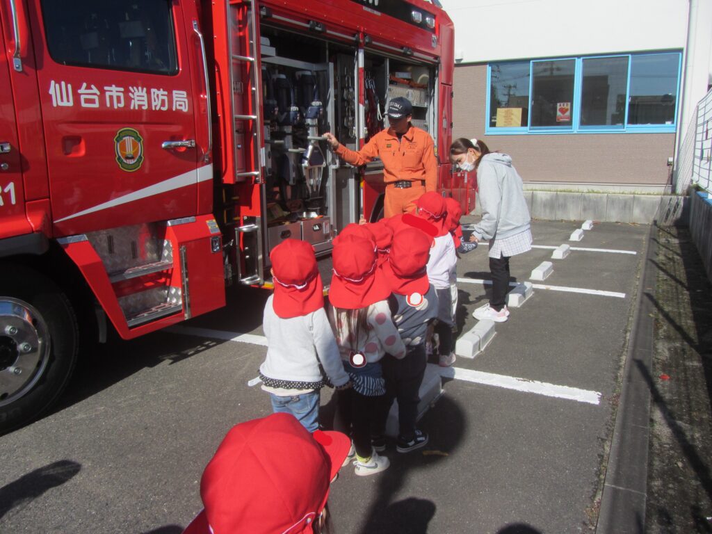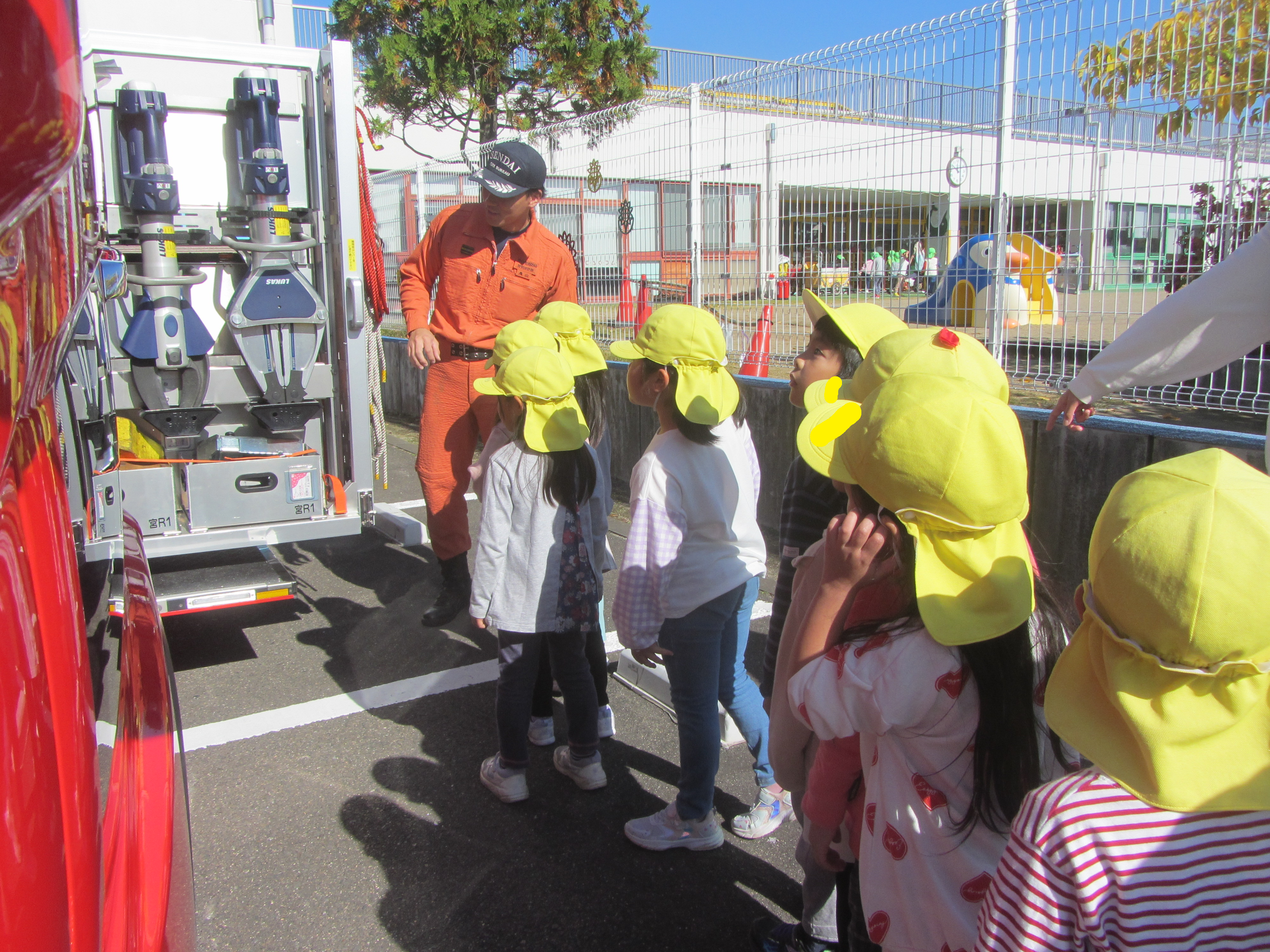 11月4日は避難訓練があり、消防署の方が来て消火訓練を行なったり消防車の中を少し見せてもらいました! 消火訓練では、「頑張れ~!」と応援しながら見ていましたよ!
