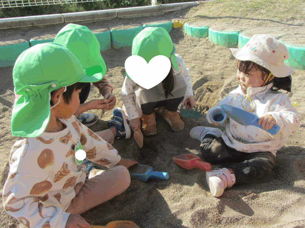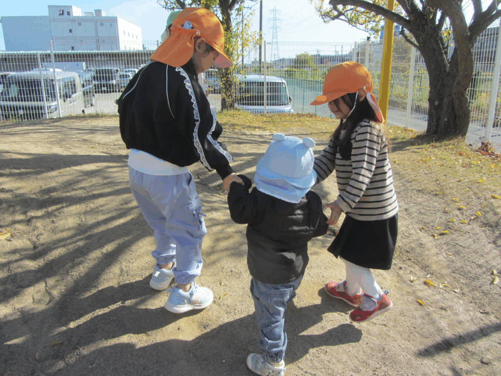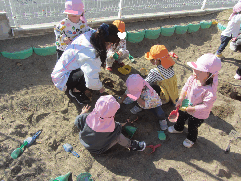 日差しが暖かい日も多く、戸外では小さいクラスのお友達と手を繋いでお散歩したり砂場で元気いっぱい遊んでいました!