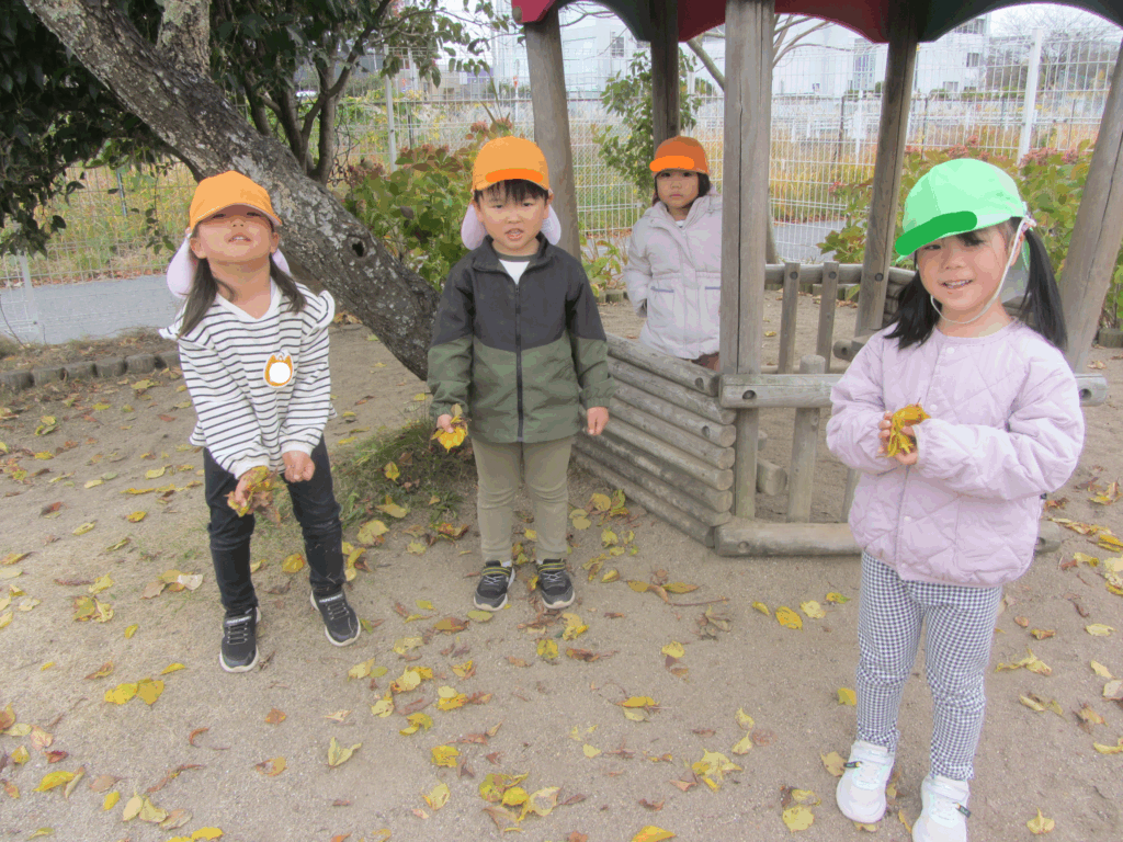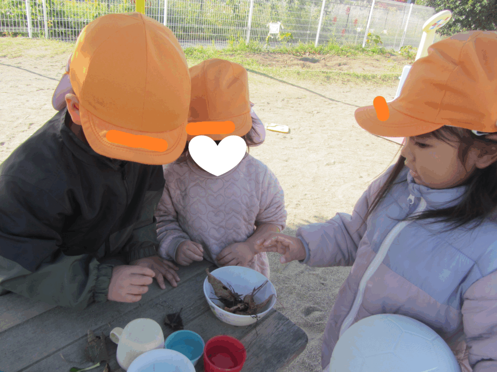 園庭の葉も色づき始め、落ち葉を使って遊ぶ姿が多く見られるようになってきました。お友達と一緒に落ち葉を集めて観察したり、お料理をして楽しむ姿がありましたよ!