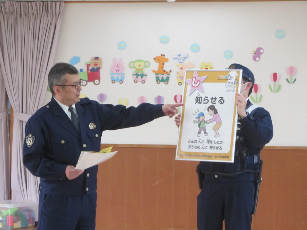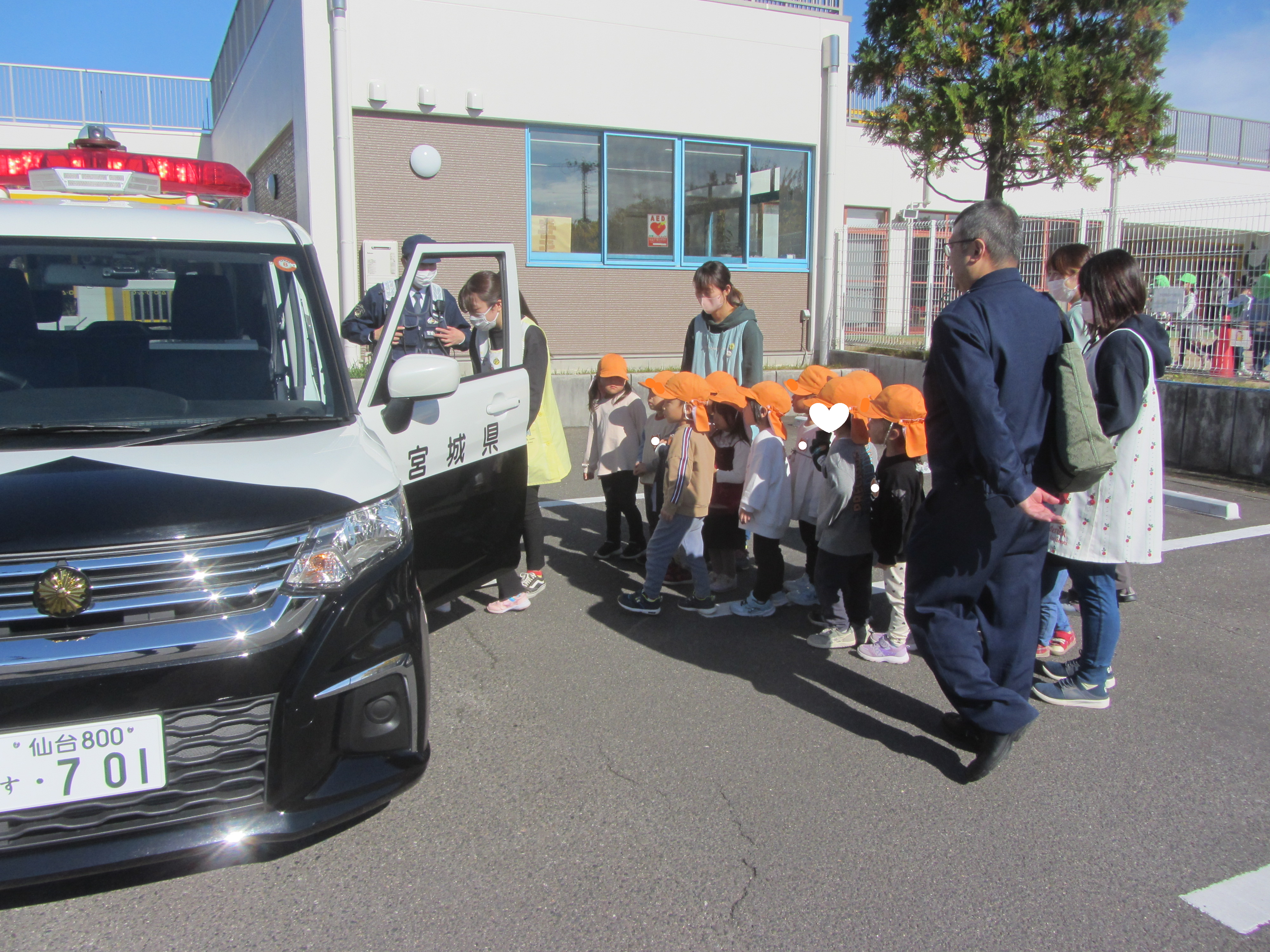 11月6日は不審者訓練があり、苦竹交番の方が来て「いかのおすし」のお話をしていただいたり、パトカーに乗らせていただいたりしました!