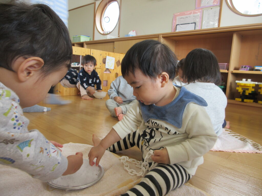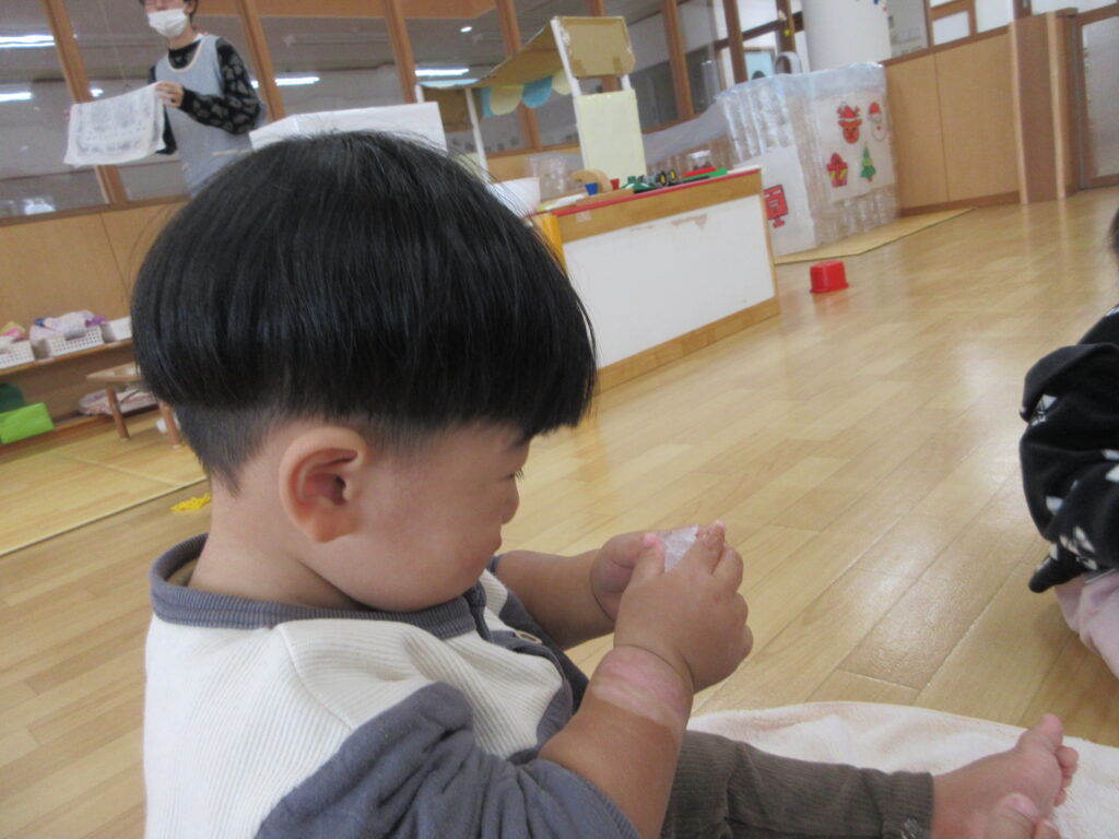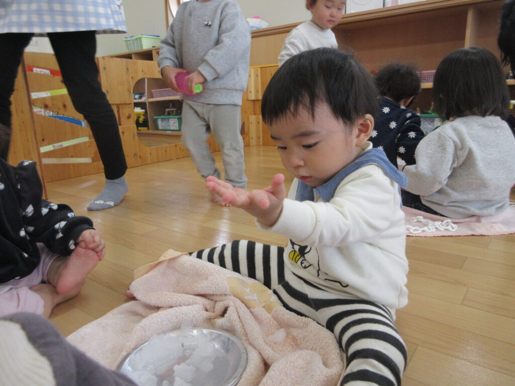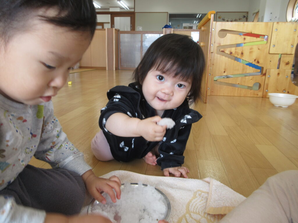 うっすらと雪が積もったので、お部屋に雪を持って来て雪遊びを楽しみました🎵