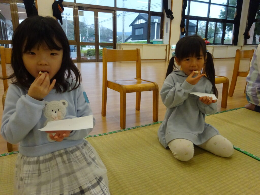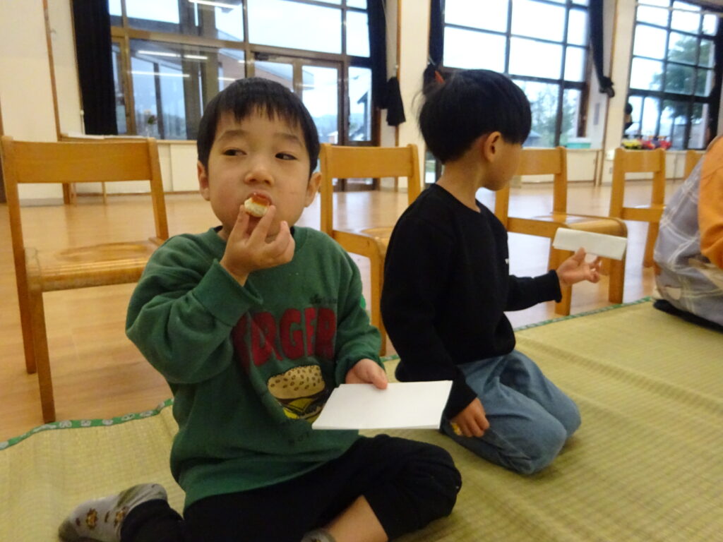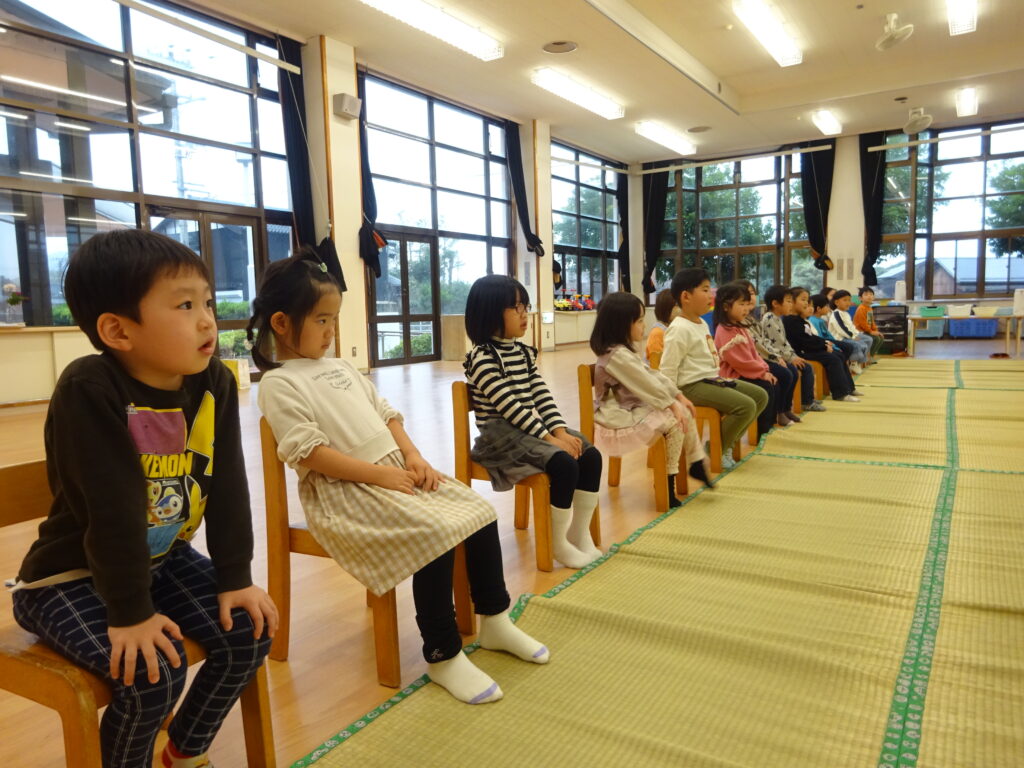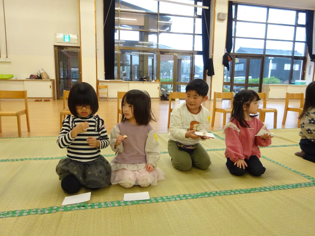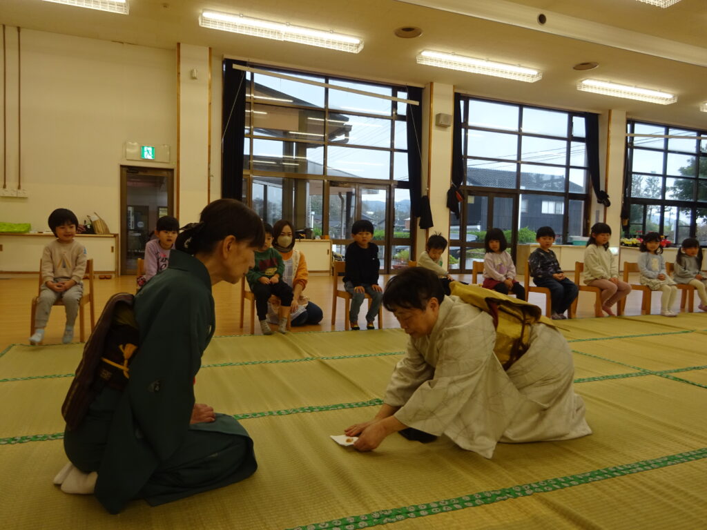 ばら組さんからのご招待があり、お茶会に参加しました。普段の行事とは違い、静かな空間に緊張した様子の子どもたち。まずはお兄さん・お姉さんの真似をして正座に挑戦!「足が…」「疲れた…」と話すこともありましたが、少し崩すとまたカッコ良い座り方に戻す姿も見られました。