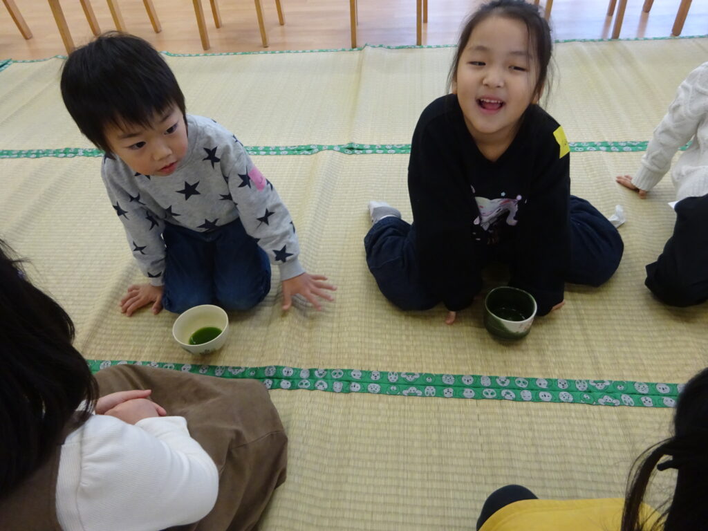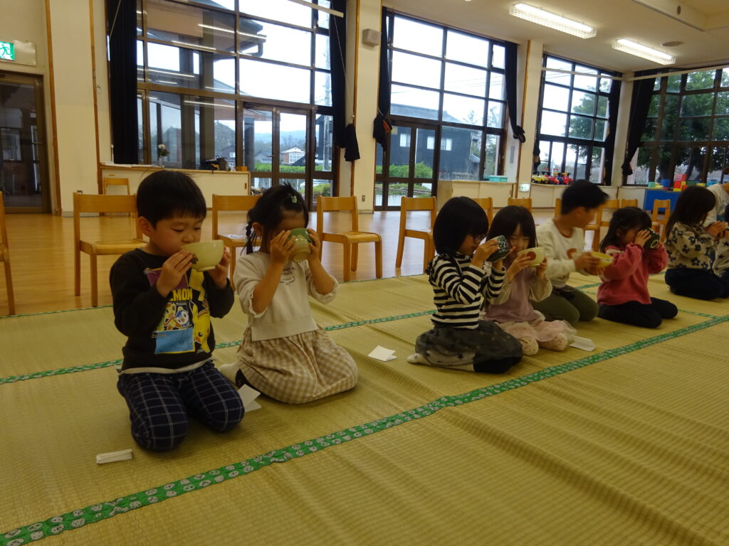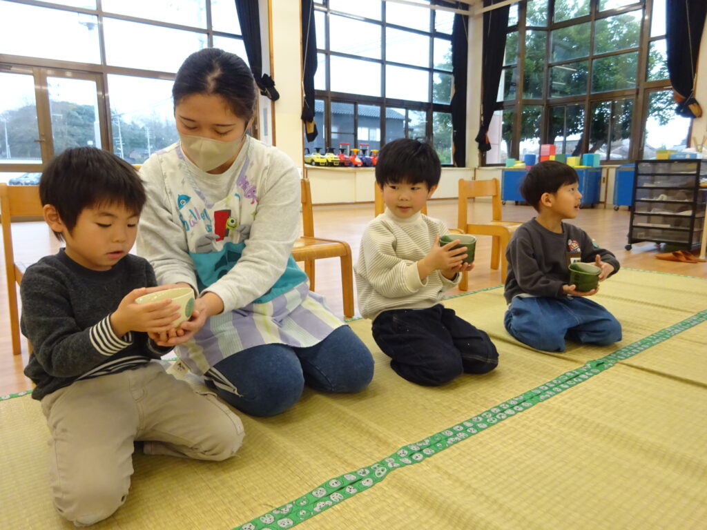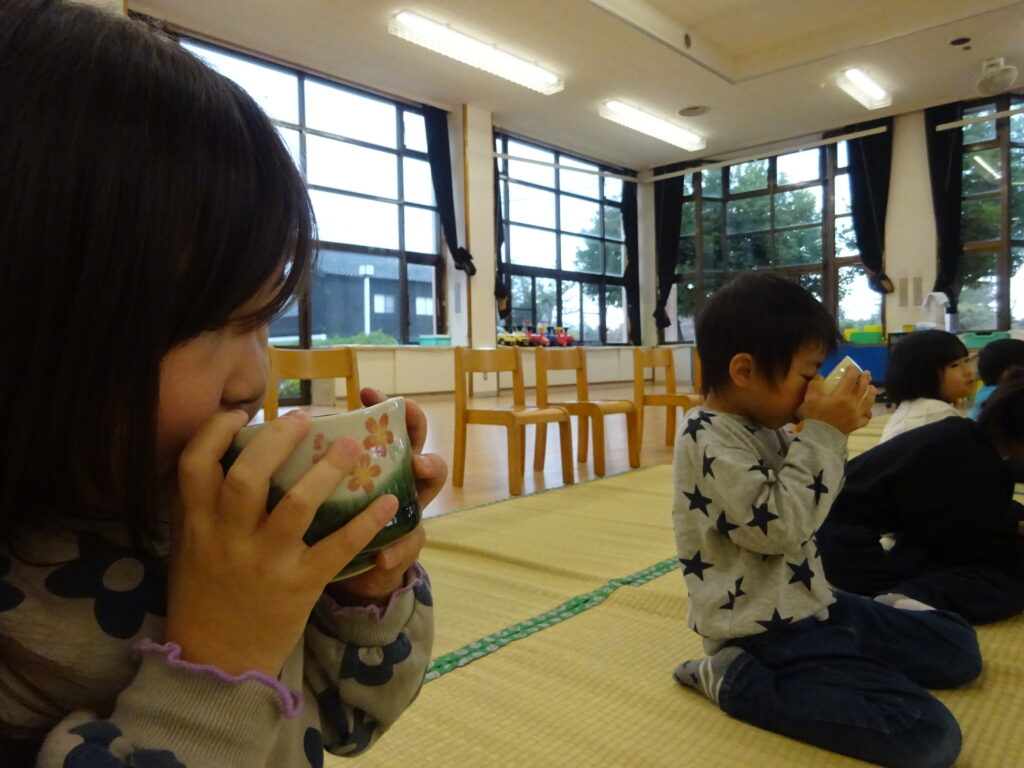 はじめて飲むお茶の味に「おいしい」と全部飲み干す子どもや、苦さを感じて残してしまう子どもと様々な姿が見られましたが、貴重な体験に大喜びなひまわり組さんでした!