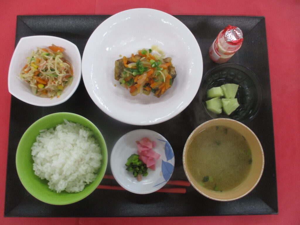 マスのみそマヨネーズ焼き ビーフンソテー ご飯 すまし汁 漬物 果物🍎🍎🍎